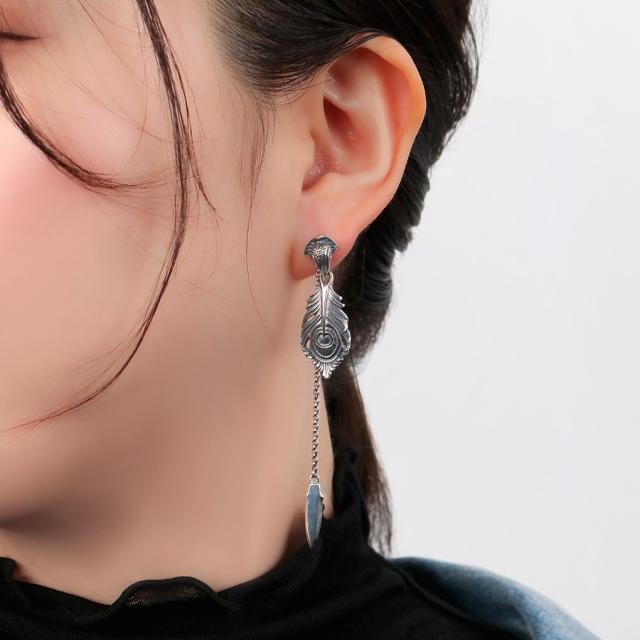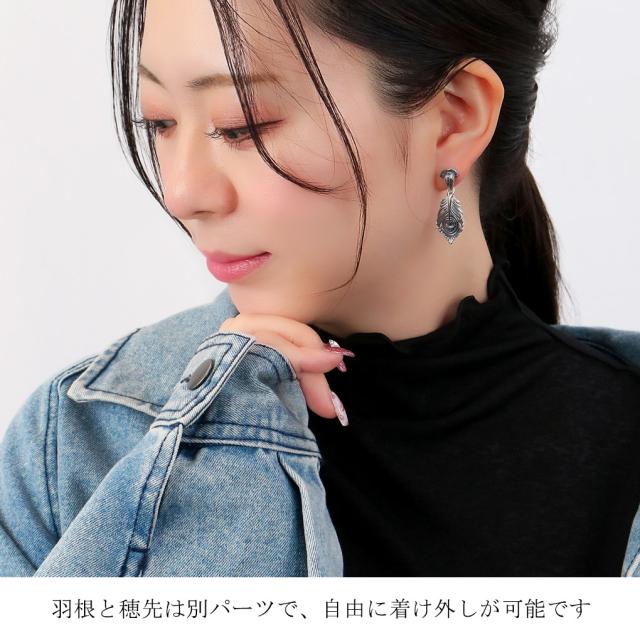 孔雀の羽根と槍の穂先、それぞれが華やかに揺れるピアス