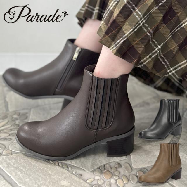 ショートブーツ レディース ブーツ 靴 サイドゴア 内側ファスナー付き 履きやすい 歩きやすい ブラック ダークブラウン オーク チャンキーヒール ヒール 5cm パレード 52904 Parade