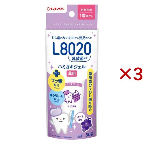 | <湿潤剤>ソルビット液、濃グリセリン、<溶剤>精製水、<粘結剤>キサンタンガム、カラギーナン<矯味剤>ラムノーザス乳酸菌/コメ発酵末、<甘味剤>キシリトール、サッカリンナトリウム、<pH調整剤>クエン酸ナトリウム、クエン酸、<香味剤>香料(グレープタイプ)、<可溶剤>グリセリン脂肪酸エステル、<有効成分>フッ化ナトリウム、<保存剤>パラベン ※L8020乳酸菌:ラムノーザス乳酸菌/コメ発酵末(矯味剤) |
