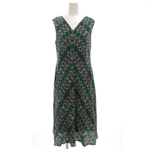 【中古】シビラ SYBILLA ノースリーブワンピース ロング Vネック 幾何学柄 総柄 絹 シルク M 緑 グリーン /GV