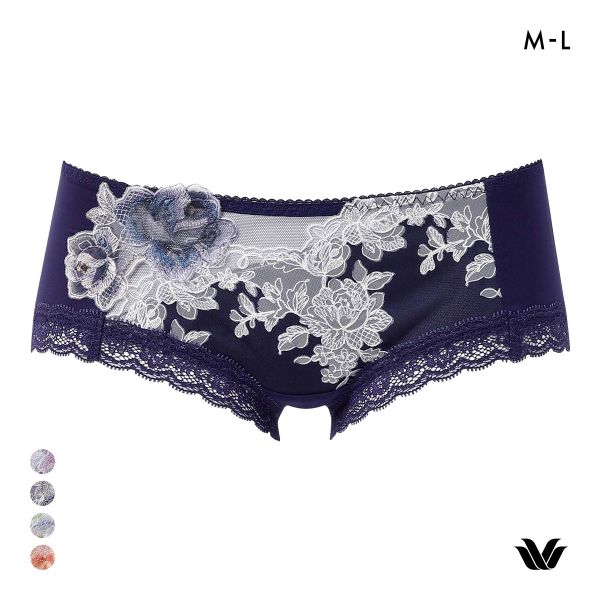フロントのレースには繊細に輝くラメ糸を散りばめ、アップリケをあしらった優雅で贅沢なショーツ。色とりどりに咲き誇るお花のモチーフが、ロマンティックで美しいデザインです。