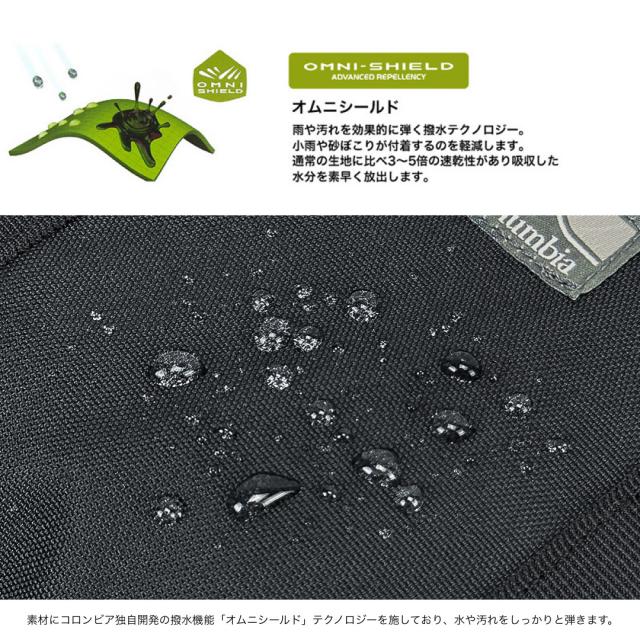 素材にコロンビア独自開発の撥水機能「オムニシールド」テクノロジーを施しており、水や汚れをしっかりと弾きます。
