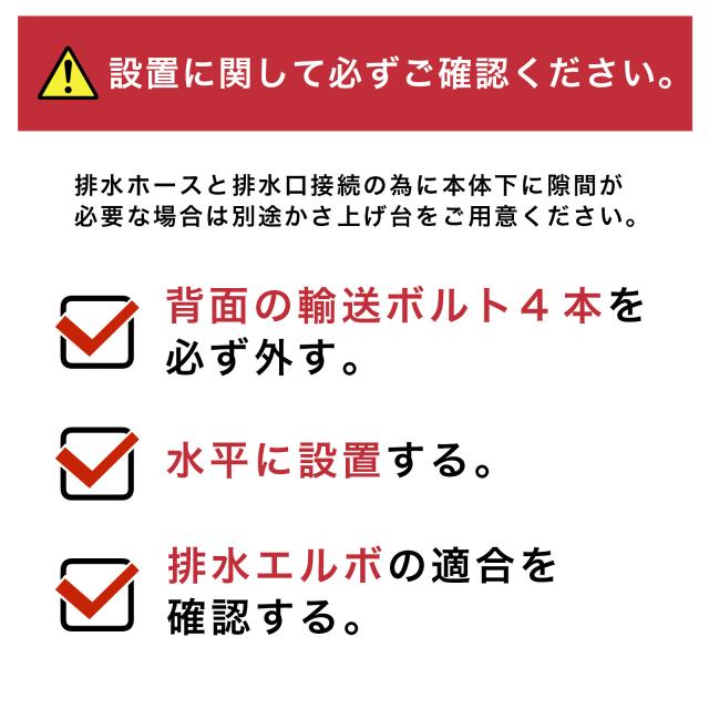 排水ホースと排水口接続の為に本体下に隙間が必要な場合は別途かさ上げ台をご用意ください。