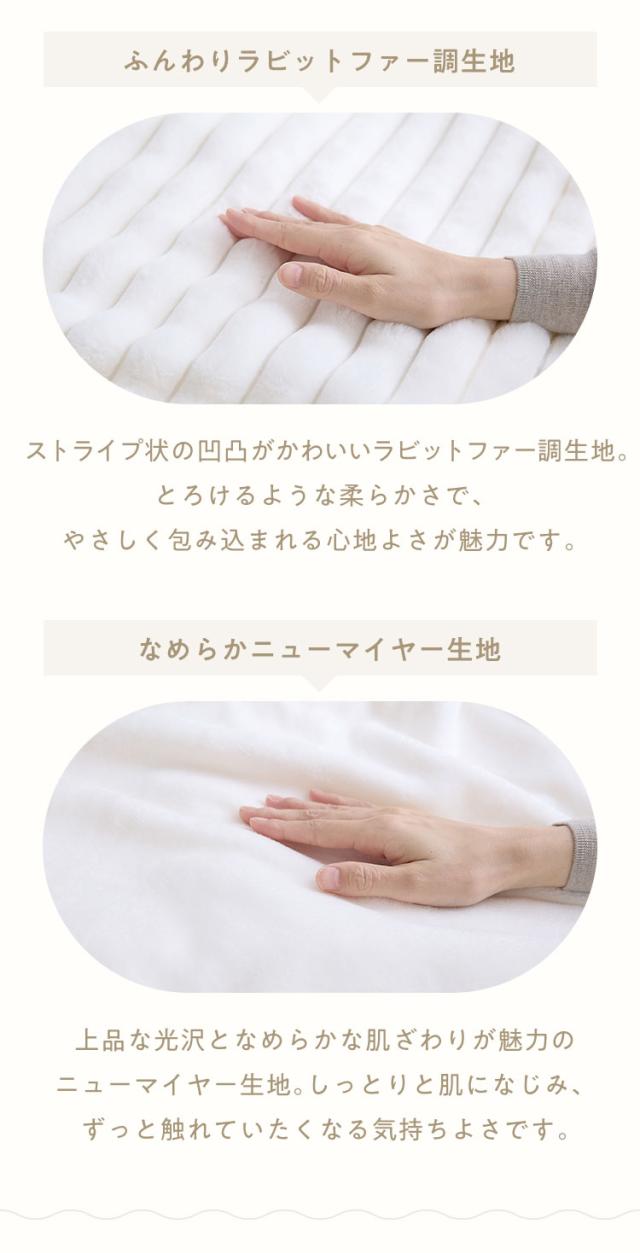 表面は針抜きストライプのラビットファー風ポリエステル生地(330g/平方メートル)を使用し、もこもこした立体感とふわふわの肌触りを実現。