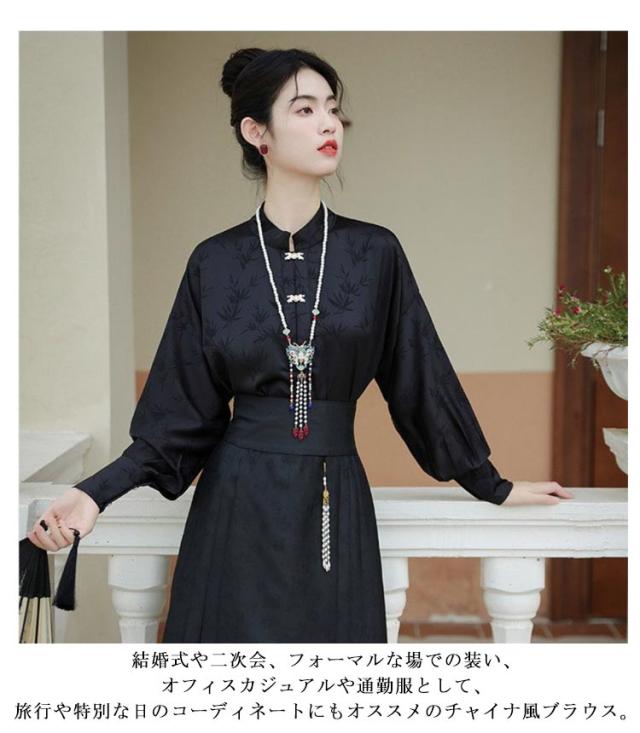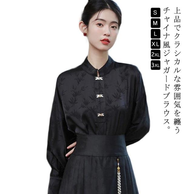 長袖 ジャガード織 チャイナブラウス 送料無料 送料無料 光沢 パフスリーブ フォーマル 大きいサイズ シャツブラウス カフス付き おしゃれ トップス 黒 モダンでかわいい 結婚式