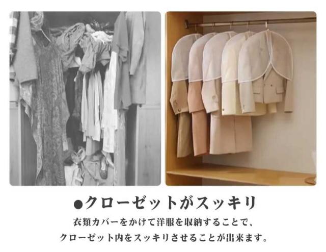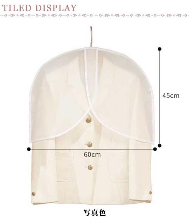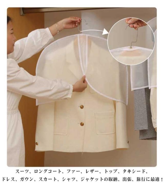 | 大切な洋服を1枚づつカバー!上からすっぽりかぶせるだけ! シーズン終わりの洋服やお出かけ用のおしゃれ着などの大切な洋服はカバーをかけて大切に保管しましょう。 ●優れた防塵性能のPEVA材質 PEVAで作られ、柔軟性ガあり、お洋服全体を覆うようにかけられるカバー、 空気がこもるのを防ぎながら、大切な洋服をホコリなどの汚れからガードします。 ●かぶせやすいハーフサイズ ほこりが積もりやすい肩部分をカバー。 かぶせやすく衣類を取りやすいので、普段使いのスーツなどにおすすめ。 保管した衣類一目で確認でき、簡単に見つけることができます。 カバーの上部には独特な開口設計があり、物掛けにより便利だ。様々なタイプのハンガーに適しています。 ●クローゼットがスッキリ 衣類カバーをかけて洋服を収納することで、クローゼット内をスッキリさせることが出来ます。 底開きタイプなので、コートなどの着丈の長い衣類にもご使用いただけます。 ●洗うことができる 万が一汚れたら、水で簡単に洗うことができます。長く使っても、旧くになり難いデザインです。なお、丈夫でやわらかく、コンパクトにたためます。小さく折りたたんで収納でき、旅行や保管に便利。 ●多用途 家族のワードローブで、出勤時や旅行、出張、引っ越し時の大切な服や普段着の収納に適しています。 スーツ、ロングコート、ファー、レザー、トップ、タキシード、ドレス、ガウン、スカート、シャツ、ジャケットの収納、出張、旅行に最適! | |