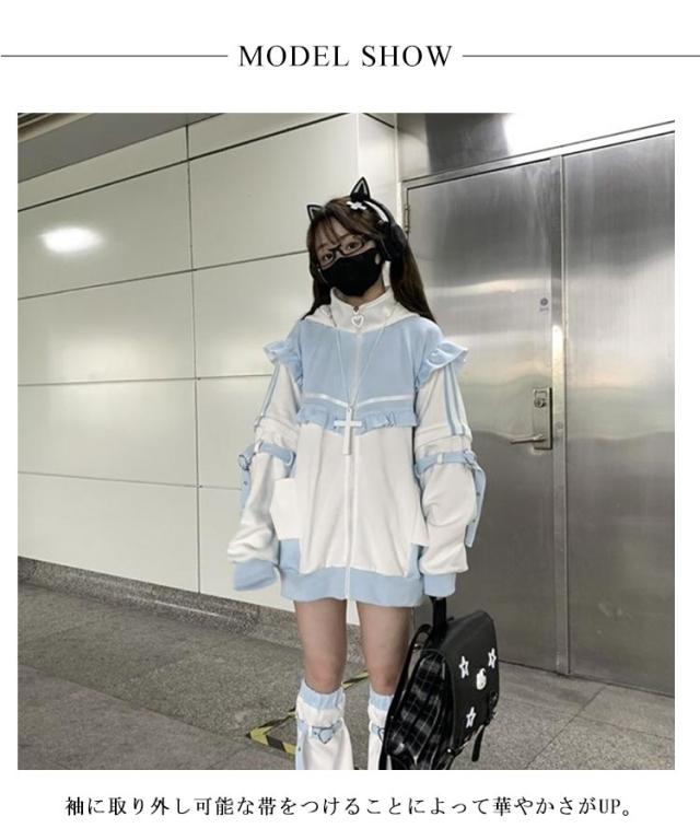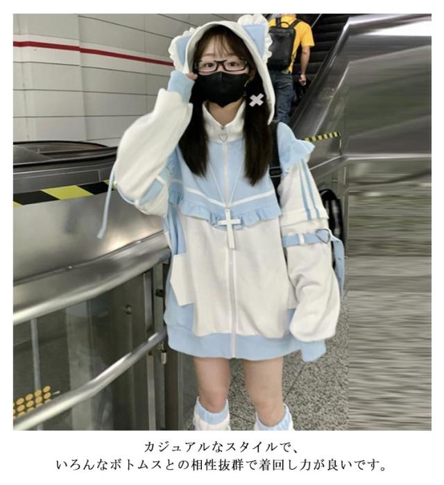 服 天使界隈 量産型 猫耳 パーカー メンズ サブカル系 姫系 パンク系 レディース 冬 コート 長袖 春 秋 猫耳 Y2K 切り替え アウター 病みかわいい ゆったり ジップアップ 配色 フリル フードつき ストリート系 ギャル服 運動服
