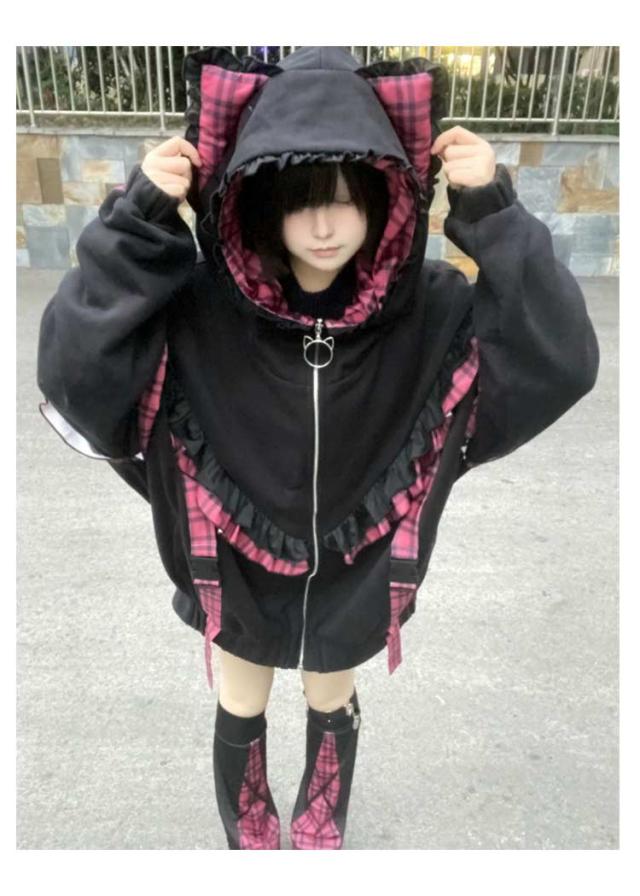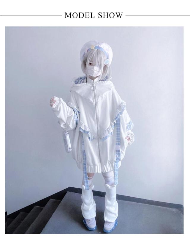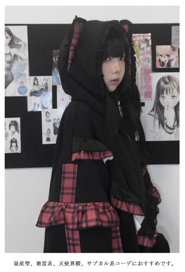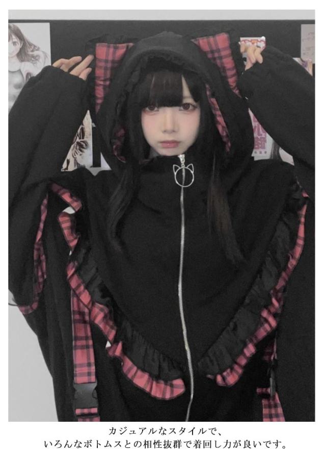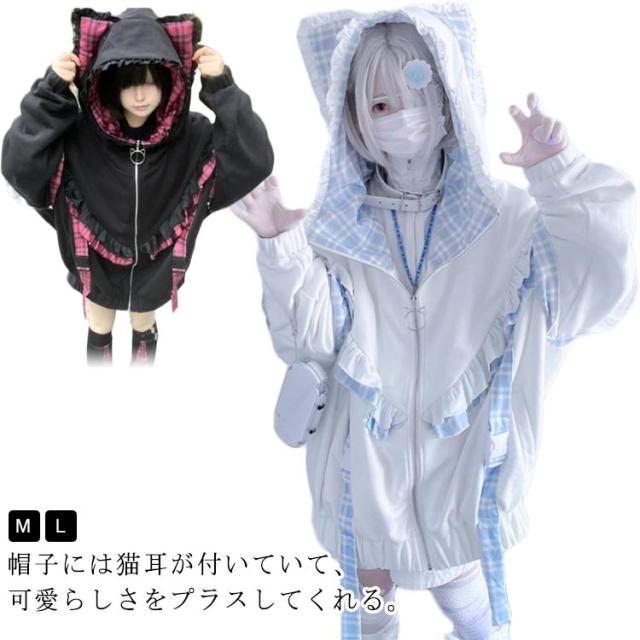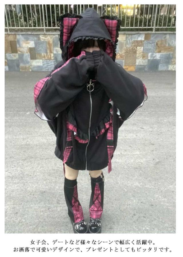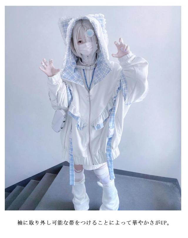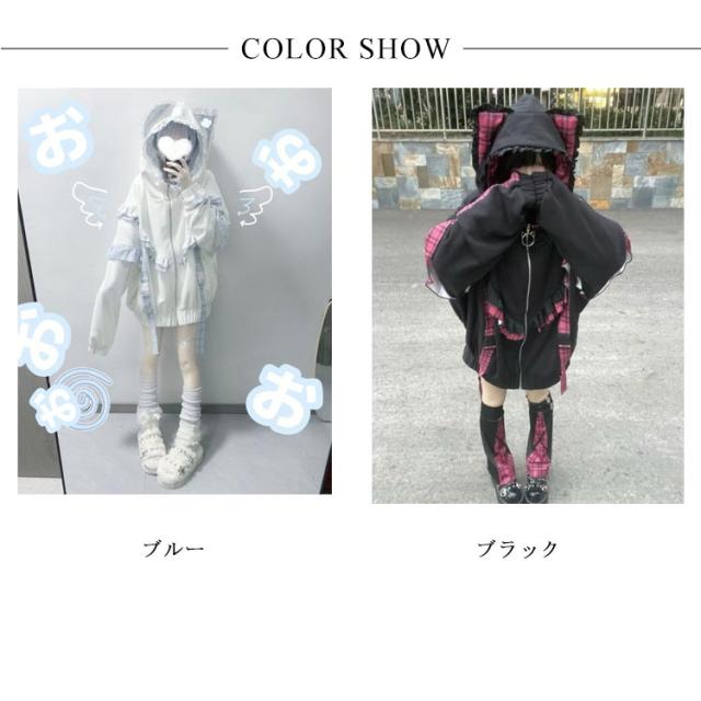 | 帽子には猫耳が付いていて、可愛らしさをプラスしてくれる。 袖に取り外し可能な帯をつけることによって華やかさがUP。 ゆったりとしたシルエットで、気になる体型をカバーして着痩せ効果が抜群です。 カジュアルなスタイルで、いろんなボトムスとの相性抜群で着回し力が良いです。 量産型、地雷系、天使界隈、サブカル系コーデにおすすめです。 女子会、デートなど様々なシーンで幅広く活躍中。お洒落で可愛いデザインで、プレゼントとしてもピッタリです。 | |