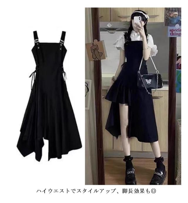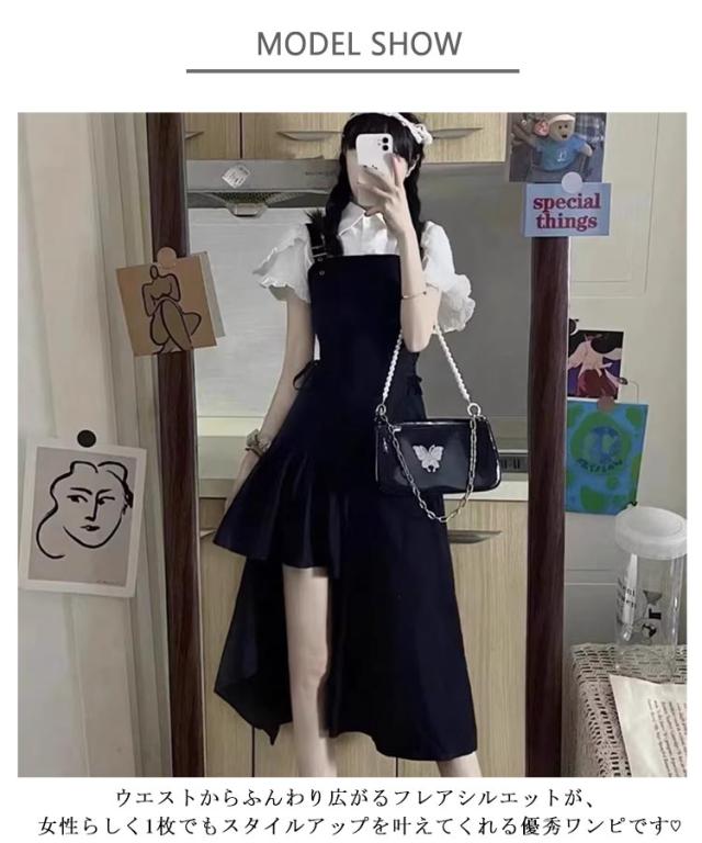 レディース フレア オールインワン サロペットスカート ジャンスカ サロペット ワンピース ロングワンピース 春夏秋 アシンメトリー Aライン ハイウエスト サイド紐 サロペスカート オーバーオール 黒 おしゃれ 大人可愛い ジャンパースカート ブラック カッコイイ