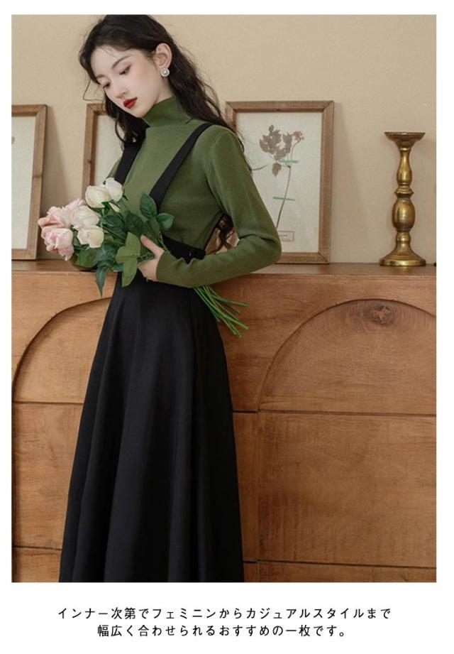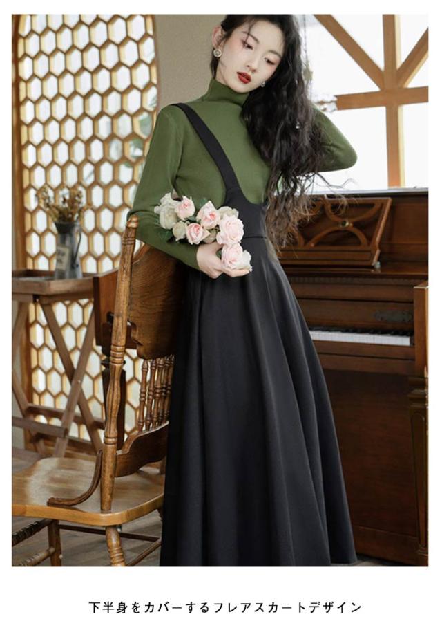 40代 ジャンスカ サロペット レディース 50代 ジャンスカ サロペットスカート aラインスカート 30代 大人可愛い ロング ジャンパースカート ハイウエスト Aライン 春夏 秋 サロペスカート オーバーオール レイヤード 重ね着 きれいめ ワンピース 体型カバー 黒 無地