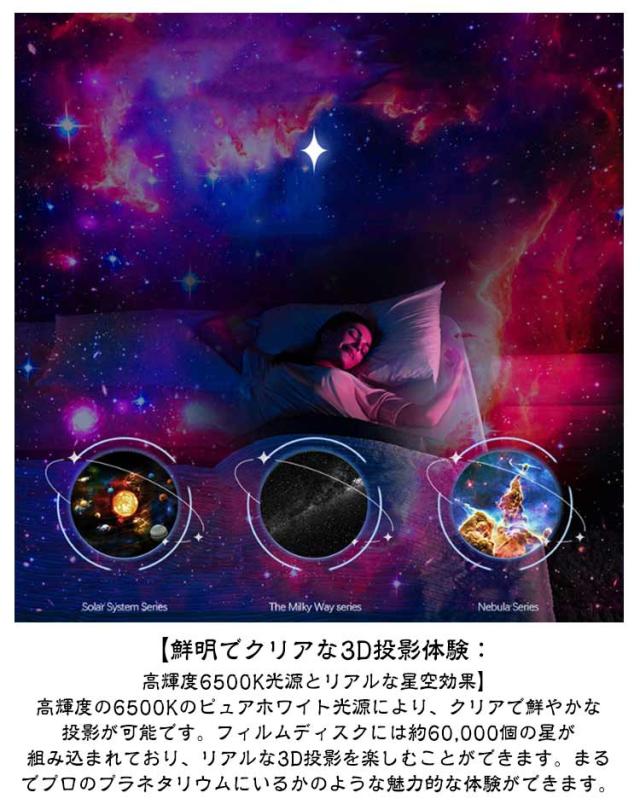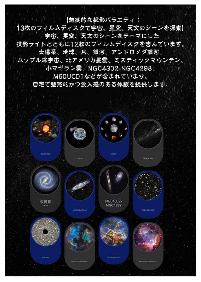 | フィルムディスク13枚付き ナイトライト プラネタリウム USB給電式 【魅惑的な投影バラエティ:13枚のフィルムディスクで宇宙、星空、天文のシーンを探索】宇宙、星空、天文のシーンをテーマにした投影ライトとともに12枚のフィルムディスクを含んでいます。太陽系、地球、月、銀河、アンドロメダ銀河、ハッブル深宇宙、北アメリカ星雲、ミスティックマウンテン、小マゼラン雲、NGC4302-NGC4298、M60UCD1などが含まれています。自宅で魅惑的かつ没入感のある体験を提供します。 【鮮明でクリアな3D投影体験:高輝度6500K光源とリアルな星空効果】高輝度の6500Kのピュアホワイト光源により、クリアで鮮やかな投影が可能です。フィルムディスクには約60,000個の星が組み込まれており、リアルな3D投影を楽しむことができます。まるでプロのプラネタリウムにいるかのような魅力的な体験ができます。 使いやすいギャラクシープロジェクター タイマー機能 プロジェクターにはタイマー設定があり、時間を選択できます。 1 時間、2 時間タイマー機能を使用して投影時間を制御できます。 調整可能な速度 投影の回転速度を好みに合わせてカスタマイズします。 フォーカス調整可 投影フォーカス調整により、最適な鮮明さと鮮明さを実現します。 投影角度 調整可 シングルアーム強化回転スタンドにより、さまざまな角度から映像を投影できます。 使い方 1.ディスクスロットを取り出します 2.フィルムディスクを交換します 3.フィルムディスクを入れますスロット 4.押し込んで調整します焦点 | |