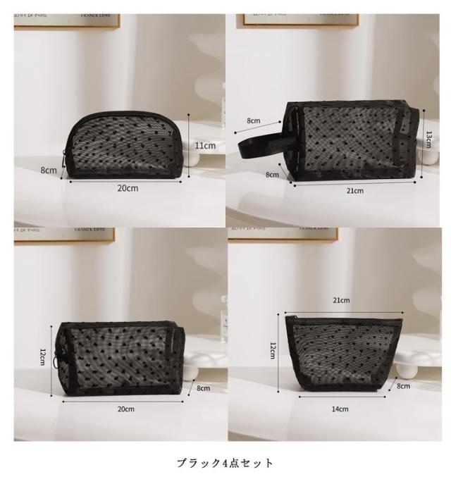 | 軽いメッシュ素材化粧ポーチ 「同色4点セット」 違いサイズのメッシュ化粧バッグを使用すると、いろいろな小物をさまざまなカテゴリに分類して整理できて、自宅やオフィスをきれいに保つことができます コスメや筆記用具、小物等使い分けて、すっきり収納できます。 濡れたり汚れても、洗える素材だから、洗面用具を入れてもOK! シースルーだからポーチの中身が一目瞭然!外から入れているものが見れて便利です。 耐久性のあるナイロンで作られたメイクポーチは、メッシュが少し硬いですが、ポーチは柔軟性があります。 普段の外出時はもちろん 旅行や出張時にバックインバックとしても活躍◎ | |