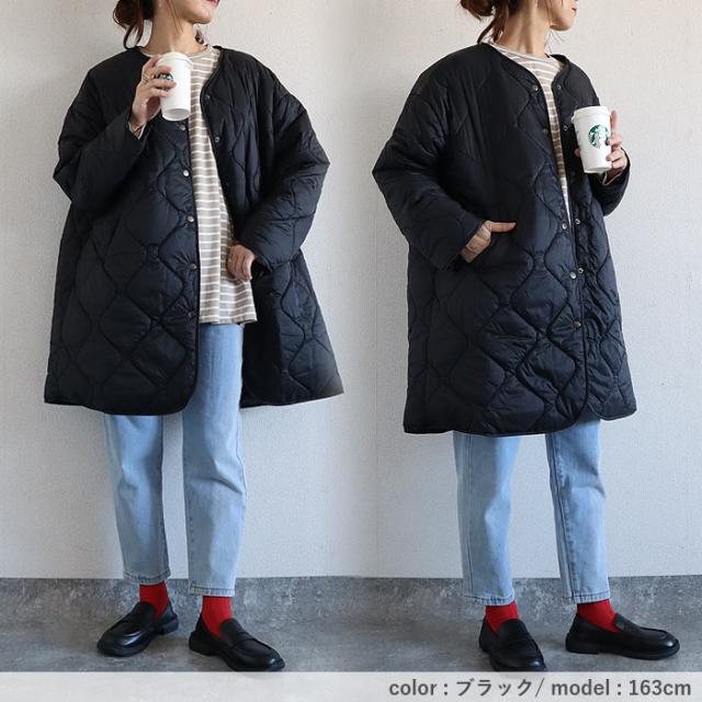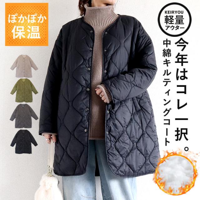 秋新作 キルティングコート キルティングジャケット レディース 中綿 ノーカラー 軽い ミリタリー ライトアウター アウター セミロング 軽量 大きいサイズ ゆったりサイズ 黒 ^jk216^ ■