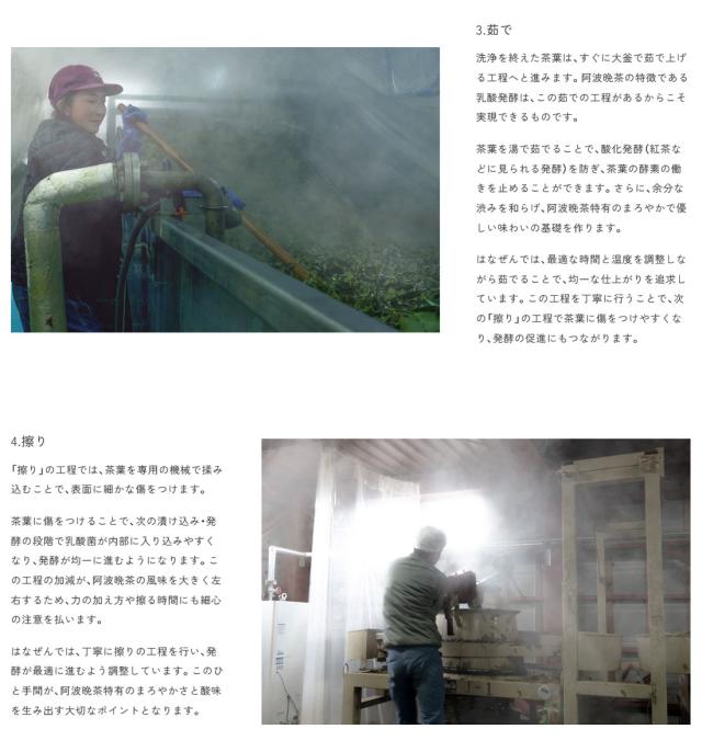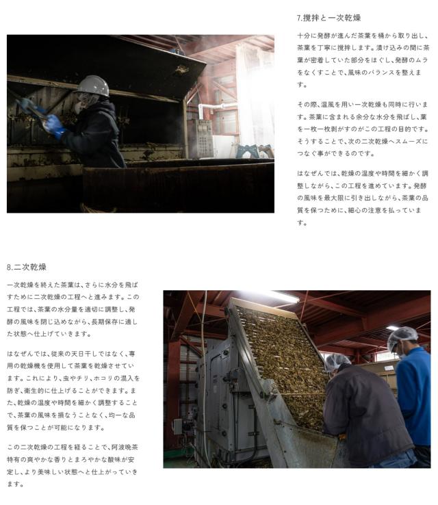 阿波晩茶は収穫から始まり、洗浄、茹で、擦り、漬け、発酵、そして撹拌と3度の乾燥、粉砕、選別…と、長い工程を経て、ようやく阿波晩茶が出来上がります。