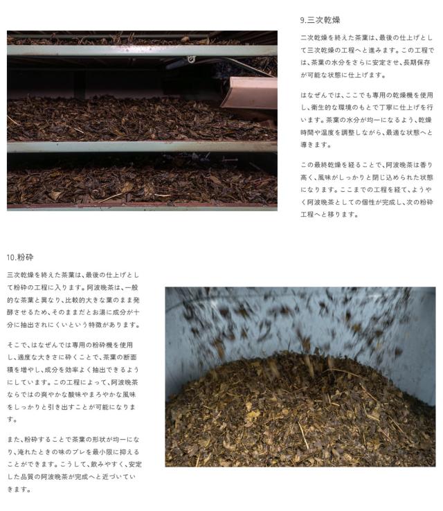 収穫から始まり、洗浄、茹で、擦り、漬け、発酵、そして撹拌と3度の乾燥、粉砕、選別…と、長い工程を経て、ようやく阿波晩茶が出来上がります。