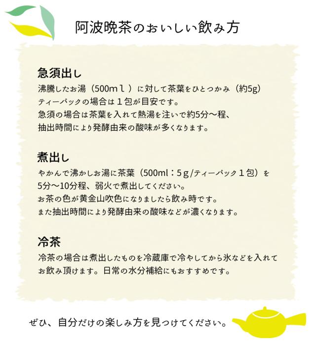 そんな阿波晩茶を手軽に楽しんでいただくために、使いやすいティーパックタイプをご用意しました。阿波晩茶の爽やかな酸味とまろやかなコクはそのままに、ティーカップや湯呑みなどで手軽に淹れられる仕様です。