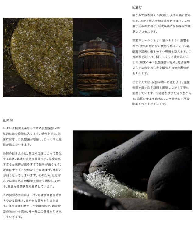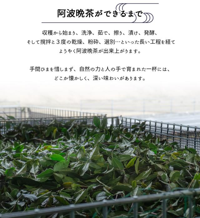丁寧に摘まれた茶葉を茹でて擦り、乳酸菌の力でじっくりと自然発酵させる。手間と時間をかけて育まれた、まろやかな味わいとやさしい香りを、ぜひ一杯に込めてお届けします。阿波晩茶は、ただのお茶ではありません。自然の力で発酵させたその独特な風味と、地元で長く愛されてきた文化の象徴です。 自然とともに生きる知恵と、変わらない手仕事の温かさを感じてください。