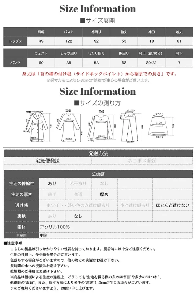 【この秋冬、ヘビロテ間違いなし!大人のための韓国ファッションニットセットアップ】 今年の秋冬は、このニットセットアップで 快適におしゃれを楽しみませんか? こだわりのデザインと着心地を追求しました。 カジュアルながらも上品な印象を与える セーターとショートパンツの2点セットは、 デイリーユースからリラックスタイムまで 幅広く活躍する優秀アイテムです。 【素材感・着心地】 思わず触りたくなるような、 ふんわりとした柔らかいニット素材を使用しています。 肌に優しい着心地 軽量で暖かく、 秋冬の寒さからもしっかり体を守ってくれます。 一度着たら手放せなくなるような、 やみつきになる着心地をご体験ください。 【シルエット・サイズ感】 セーターは程よくゆったりとしたオーバーサイズシルエットで、 気になる体型をカバーしつつ、 華奢見え効果も期待できます。 ショートパンツは脚をすっきりと見せる丈感で、 リラックス感がありながらもだらしなく見えないのがポイントです。 FREEサイズ展開ですが、 伸縮性があるので幅広い体型の方にフィットします。 【機能性】 トップスとボトムスがセットになっているので、 コーディネートに悩むことなくサッと決まります。 別々にも着用できるため、着回し力も抜群。 ちょっとしたお出かけにも対応できるデザインでありながら、 ルームウェアとしても活躍する万能さも魅力です。 ご自宅での洗濯も可能(※洗濯表示をご確認ください)でお手入れも簡単です。 【着回し&コーデ提案】 セットアップで: そのままで大人可愛いリラックスカジュアルスタイルが完成。 足元はスニーカーやショートブーツで季節感をプラス。 トップス単体で: デニムパンツやワイドパンツと合わせて、 カジュアルダウンしたスタイリングに。 スカートと合わせればきれいめカジュアルにも。 ショートパンツ単体で: お手持ちのオーバーサイズの スウェットやパーカーと合わせて、抜け感のあるおうちコーデに。 ロングブーツとの相性も抜群です。 インナーを覗かせて: セーターの下に白TシャツやロンTを レイヤードすれば、旬の着こなしに。 |
