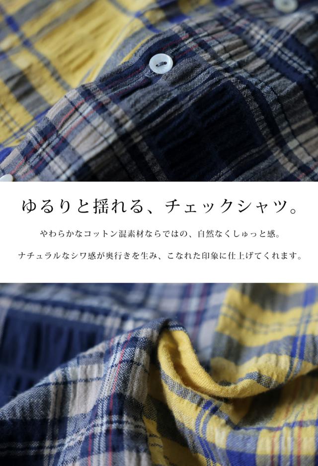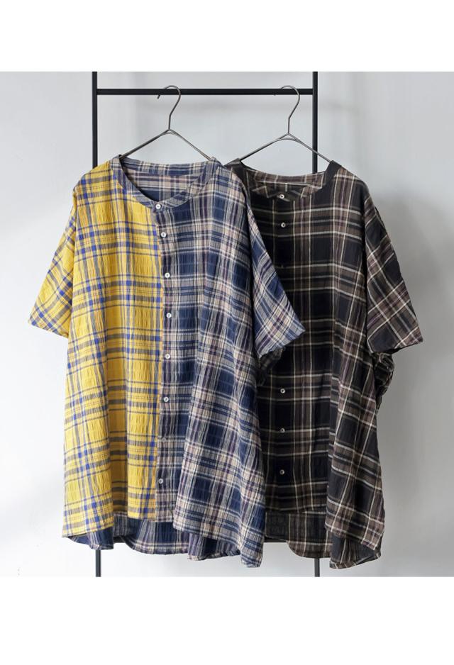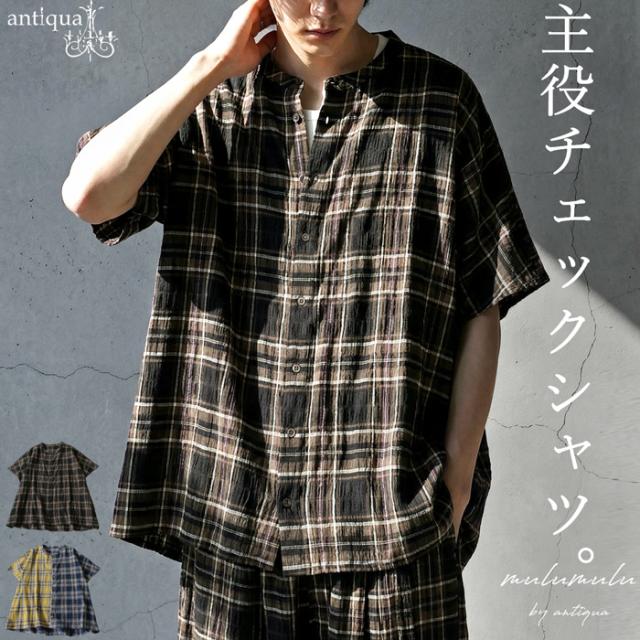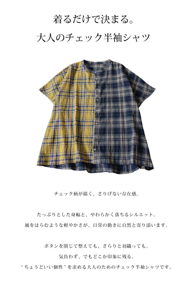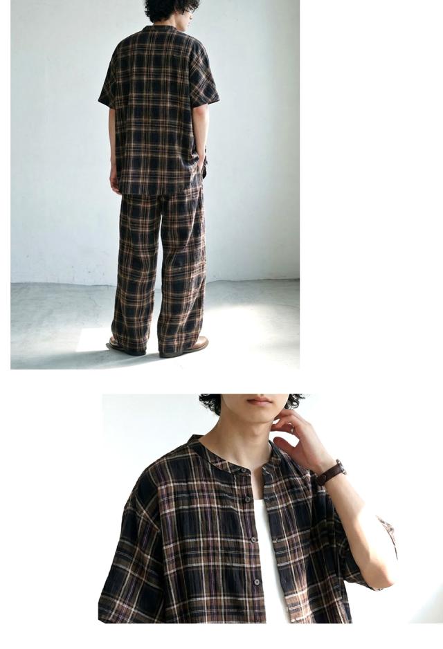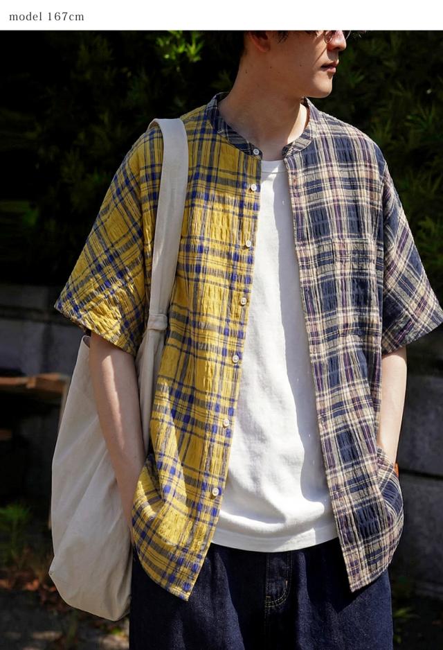 iyz-00012z トップス 柄シャツ 綿100% コットン セットアップ バンドカラー ゆったり シルエット 体型カバー ナチュラル カジュアル ユニセックス チェック 柄 シワ感 着痩せ