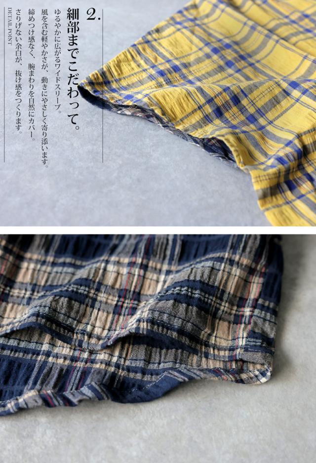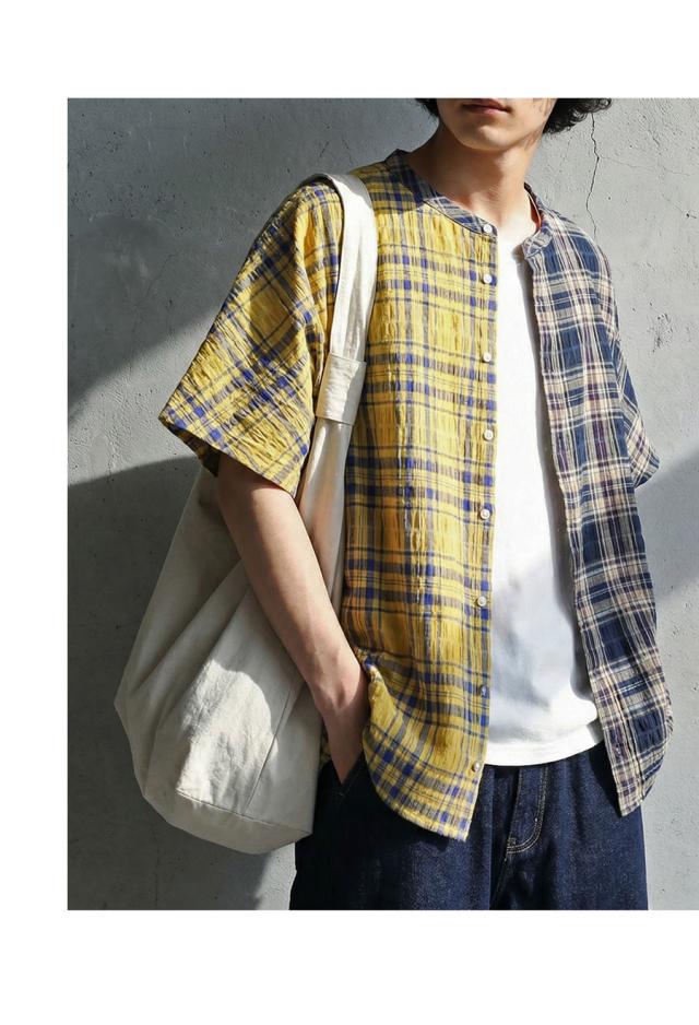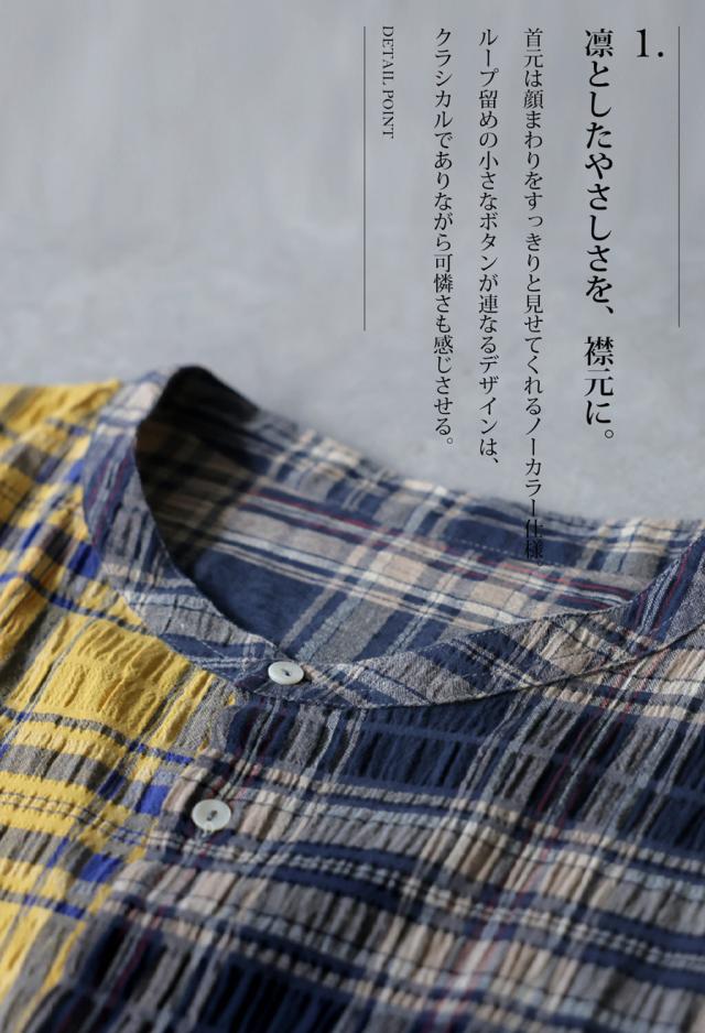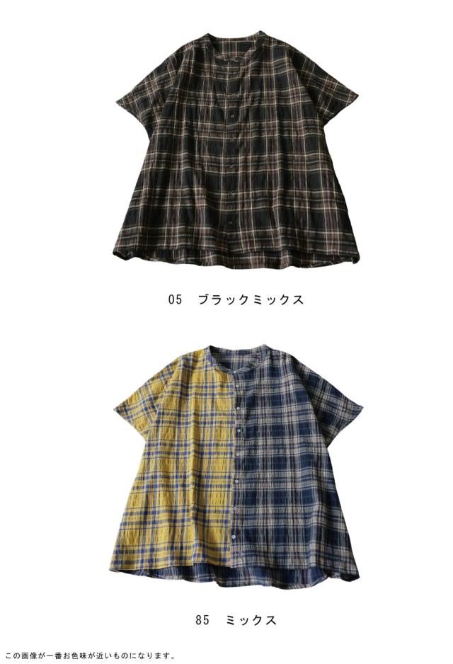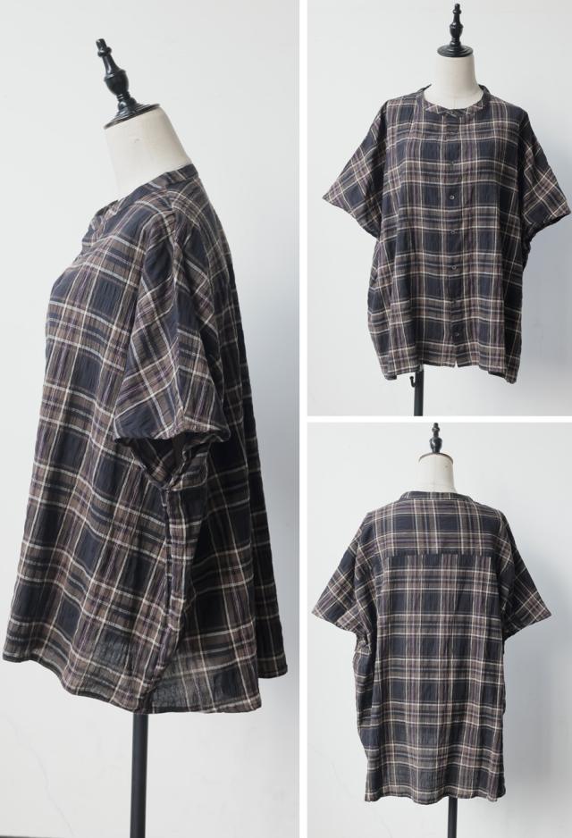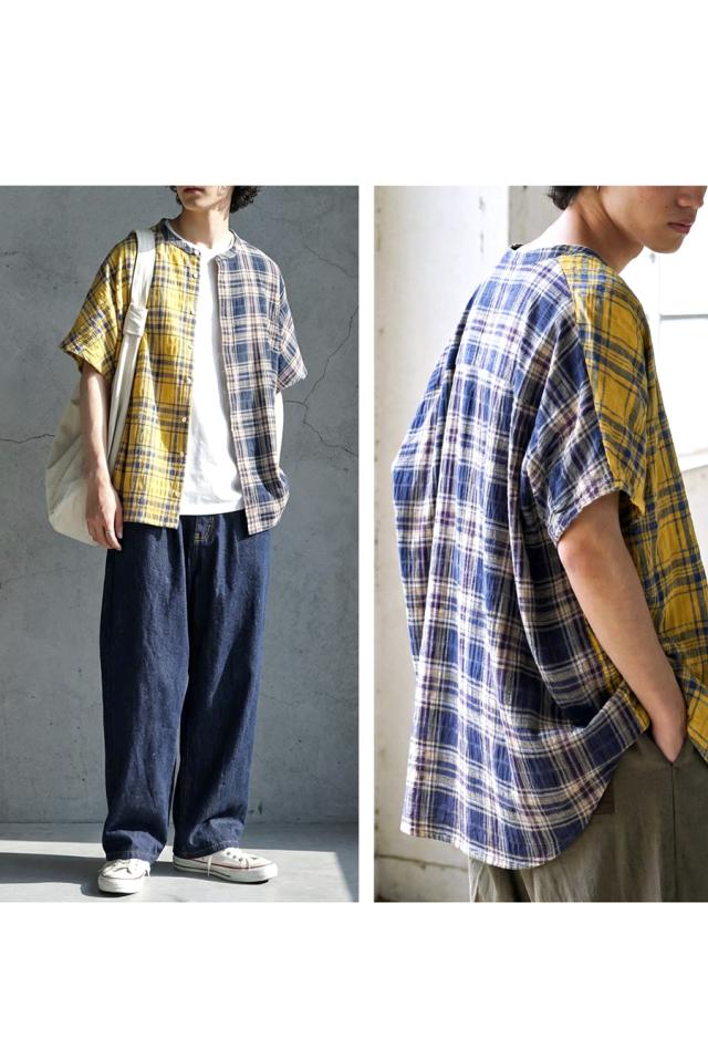 iyz-00012z トップス 柄シャツ 綿100% コットン セットアップ バンドカラー ゆったり シルエット 体型カバー ナチュラル カジュアル ユニセックス チェック 柄 シワ感 着痩せ