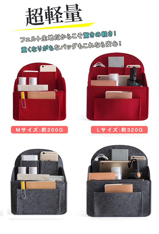 リュックにもトートにも軽量スリムな空間活用術 縦型バッグインバッグ フェルト生地だからこそ驚きの軽さ! 重くなりがちなバッグもこれなら安心! メインポッケトのインナーポッケトが取り出し可能です。 リュックにもトートバッグにも! 入れ替えも簡単にできます♪ ※モニター環境により多少色合いが異なりますので、予めご了承くださいませ。 |