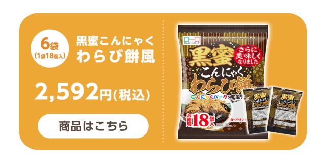 | 人気の個包装タイプのわらび餅ゼリーから、ねっとりとした食感と軽やかな甘さが特徴の「とろ〜りこんにゃくわらび餅風」が新登場。そのままでも美味しくお召し上がりいただけますが、黒蜜やきな粉を付けて食べても、より一層美味しくお召し上がりいただけます。 |