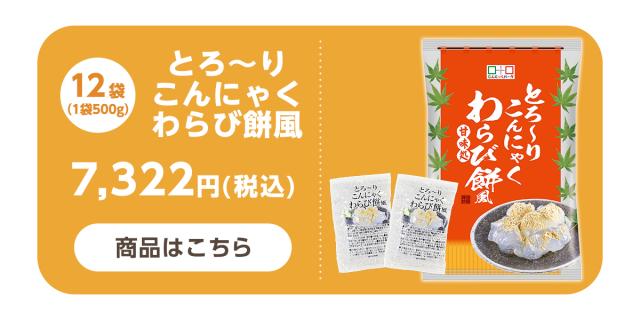 | 人気の個包装タイプのわらび餅ゼリーから、ねっとりとした食感と軽やかな甘さが特徴の「とろ〜りこんにゃくわらび餅風」が新登場。そのままでも美味しくお召し上がりいただけますが、黒蜜やきな粉を付けて食べても、より一層美味しくお召し上がりいただけます。 |