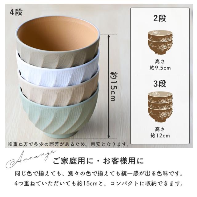 まるで木製?!と思うほど繊細な木目模様に、職人がひとつひとつ手作りしたような彫刻模様と研ぎ出し技法を再現したフォルム。 色味は淡さの中に深みがある、くすみカラーで、どこか可愛さもあるおしゃれな汁椀です。 樹脂製だから軽くて丈夫!落としても割れにくい♪ 美しさと扱いやすさを兼ね備えた逸品です。 汁物はもちろん、ごはん茶碗や副菜の盛り付けにも使いやすいサイズ。 落ち着いたくすみカラーが食卓に馴染み、和・洋問わずさまざまなお料理を引き立てます。 和食に合わせて、味噌汁や煮物を引き立て、食卓をあたたかく上品に演出します。 洋食に合わせて、スープやシチューにも馴染み、カフェ風の雰囲気が楽しめます。 抗菌剤を含んだ塗料で塗り上げる製法で、塗装面に付着した菌の増殖を抑えます。 また、お子さまにも安心なBPAフリー仕様です。 高台があるため、手にしっかりフィット。 汁椀自体が軽く、たっぷり入れても持ちやすい♪食べやすさにもこだわりました。 木の香りがしそうなほど、うっとりする木目模様が美しい汁椀は、引き出しに仕舞わず、棚に並べても絵になります。 スタッキング(重ね置き)もできるため、家族分そろえてもすっきり収納できます。(4段重ねて、高さ約15cm) お料理が冷めたら、電子レンジであたため直しができます。(500〜600Wで加熱時間1分以内) 家庭用食洗機・乾燥機対応!忙しい毎日に優しい仕様です。 |