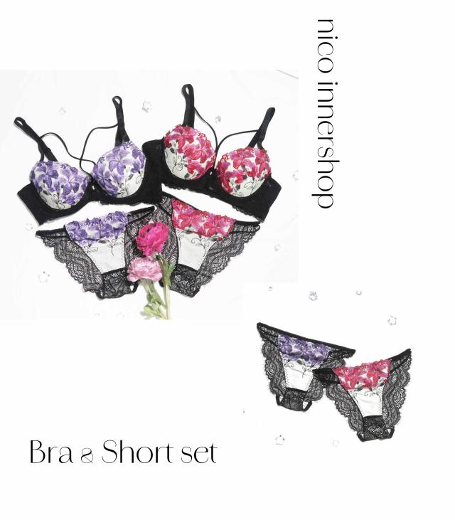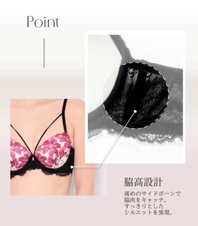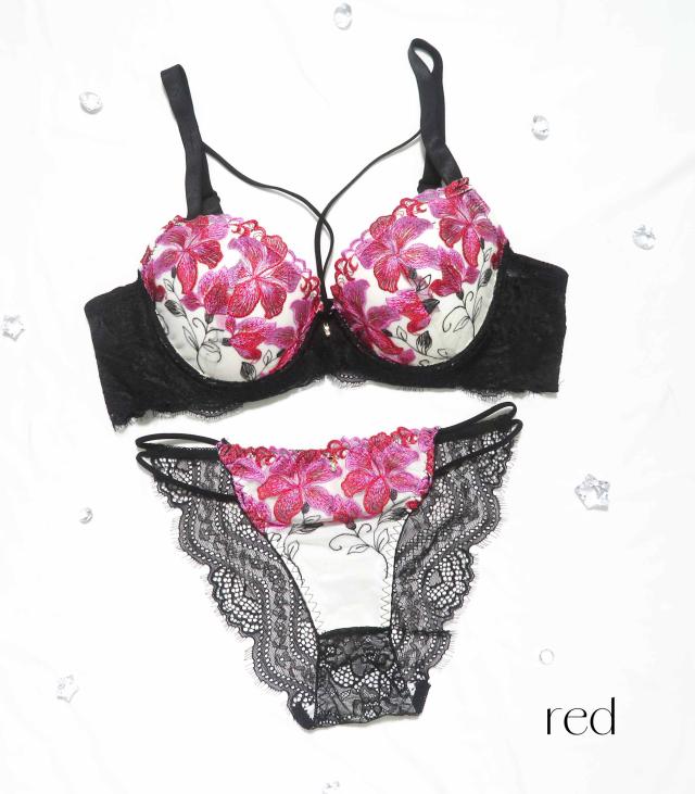 大柄なフラワー刺繍が胸元を華やかに彩るブラ&ショーツセット。