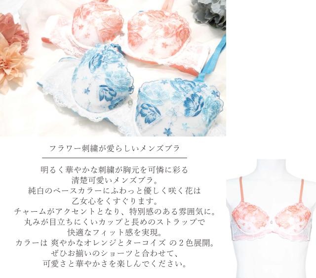 明るく華やかな刺繍が胸元を可憐に彩る清楚可愛いメンズブラ。