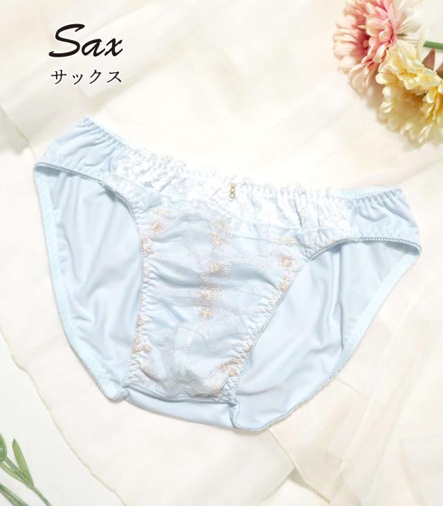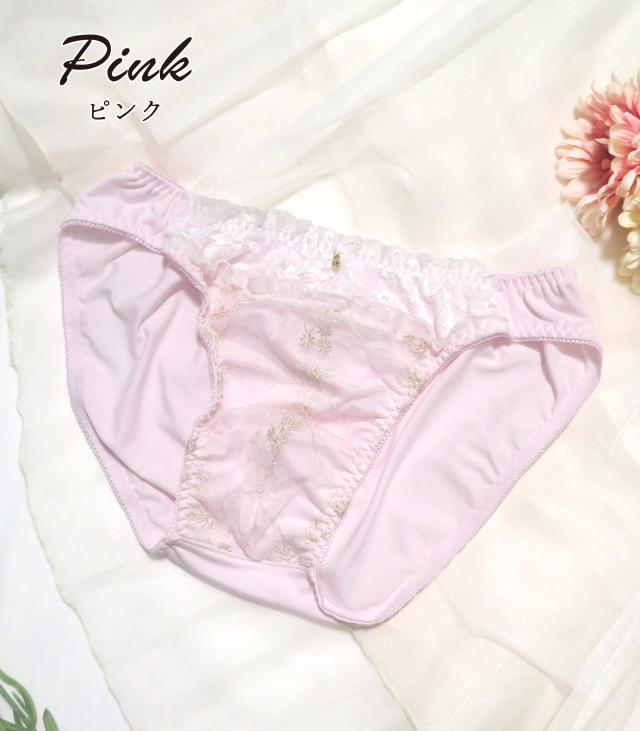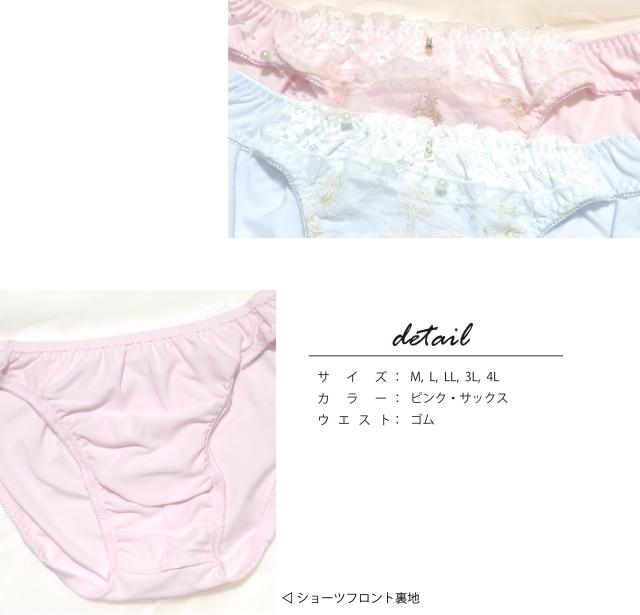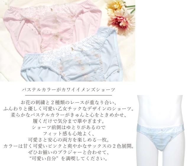 お花の刺繍と2種類のレースが重なり合い、ふんわりと優しく可愛い乙女チックなデザインのメンズショーツ。