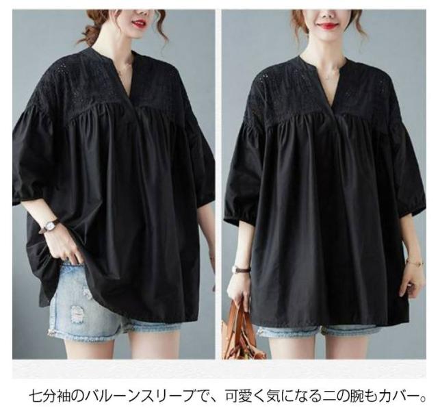 花柄モチーフ レース シャツ ブラウス 半袖 レディース バルーンスリーブ スキッパーシャツ レース切替 スキッパーブラウス オーバーシャツ 半袖 ボリューム トップス シャツブラウス 花柄レース 体型カバー ゆったり 涼しい 春夏 ブラック ホワイト