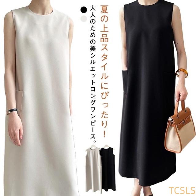ワンピース 夏物 レディース ノースリーブ ロングワンピース 無地 きれいめ ドレス 体型カバー 着痩せ 華奢見え 袖なし シンプル スッキリ エレガント 上品 大人 ポケット付き カジュアル オフィス 通勤 OL 30代 40代 50代 送料無料