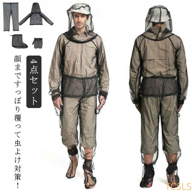 【4点セット】 顔まですっぽり 虫除けウェア 虫よけウェア 虫よけネット 防虫ネット 蚊よけ メッシュ 虫除け ウェア パーカー ズボン 足カバー 手袋 防虫 畑用 採集 釣り 軽量 耐久性 速乾性 通気性 農作業