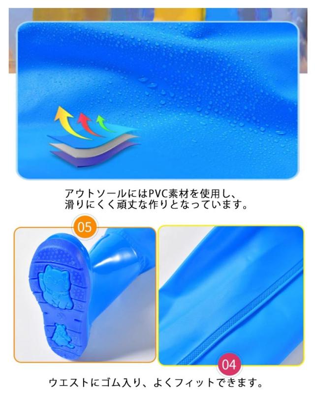 | 一体型 レインウェア&レインブーツ 15-23cm 成長に合わせて肩ひものチャックのかけ替えでサイズアップ成長の早いお子供でも長い間楽しめます。 ウエストにゴム入り、よくフィットできます。 アウトソールにはPVC素材を使用し、滑りにくく頑丈な作りとなっています。 | |