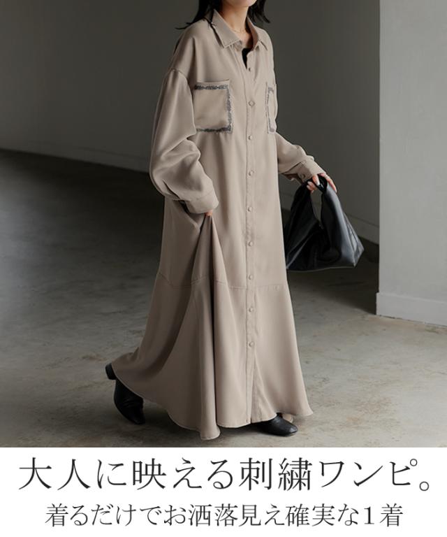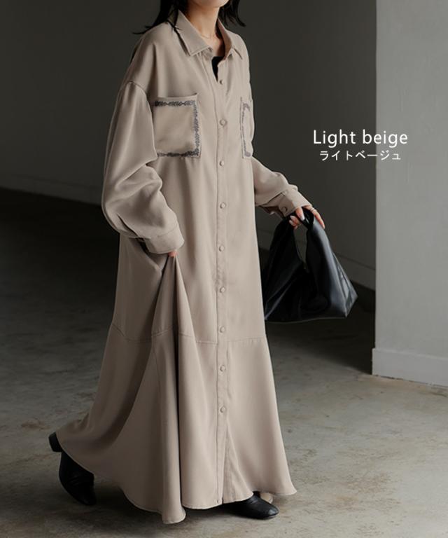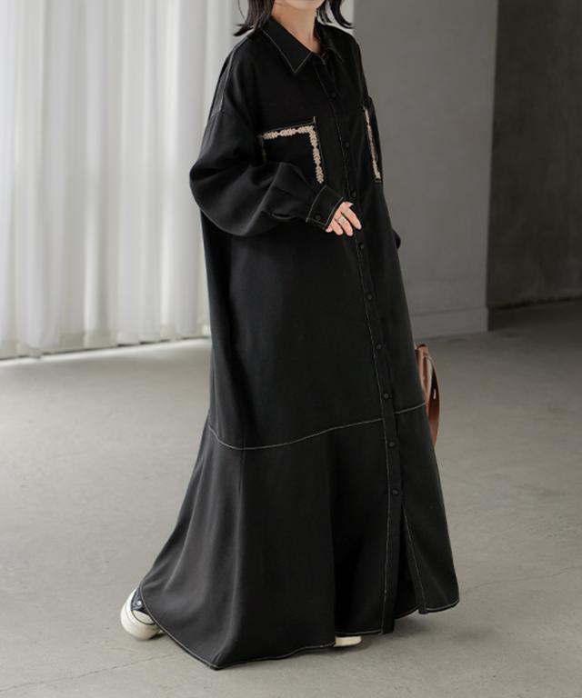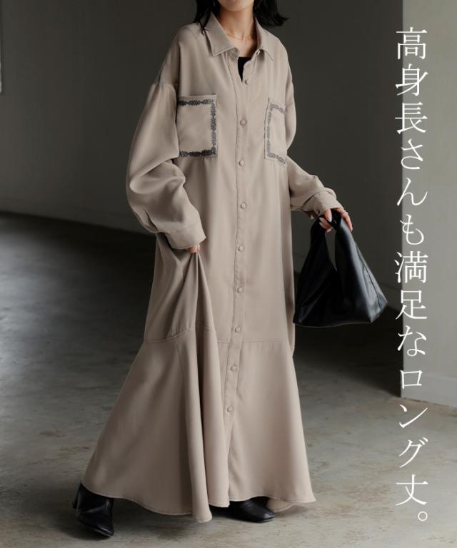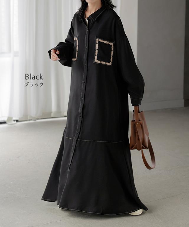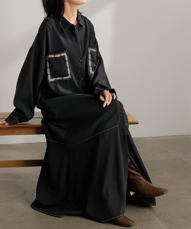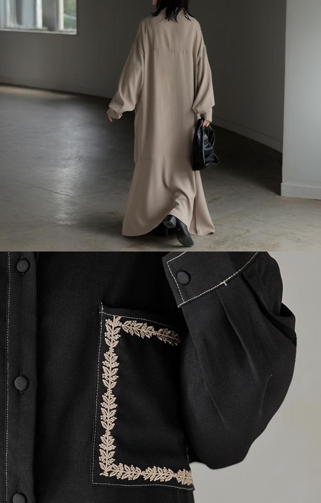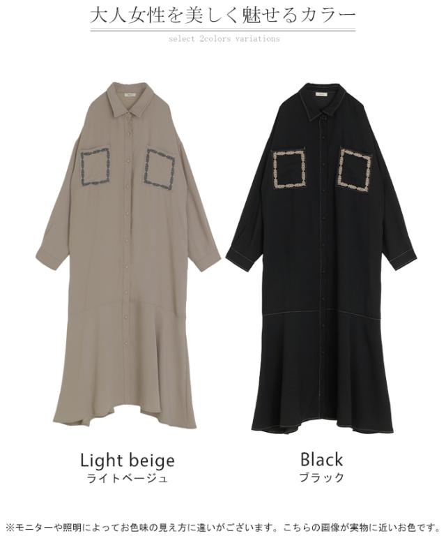 2025AW新作 ワンピース シャツ 長袖 シャツワンピース シャツワンピ レディース ロング ロングワンピース Aライン マキシ マキシワンピース ワンピ ロングシャツ ビッグ ポケット 刺繍 ロングワンピ 羽織 体型カバー 二の腕カバー 黒 ベージュ 秋 冬 HUG.U
