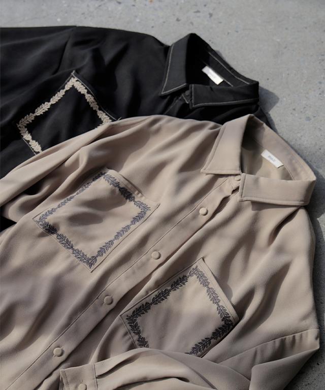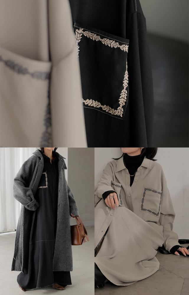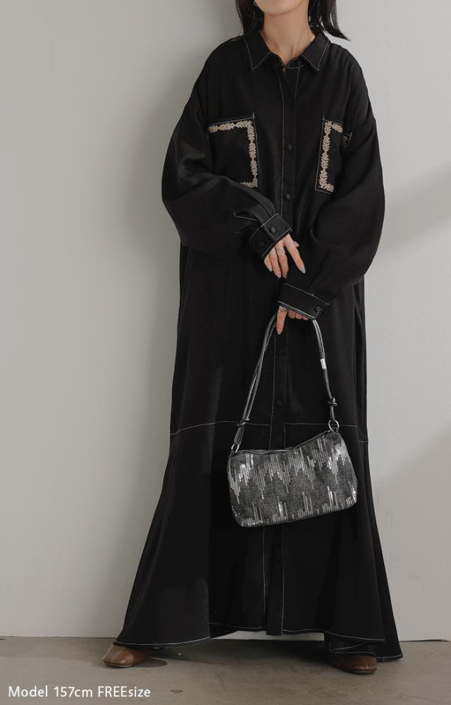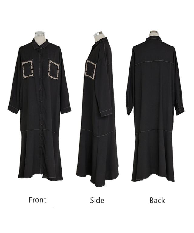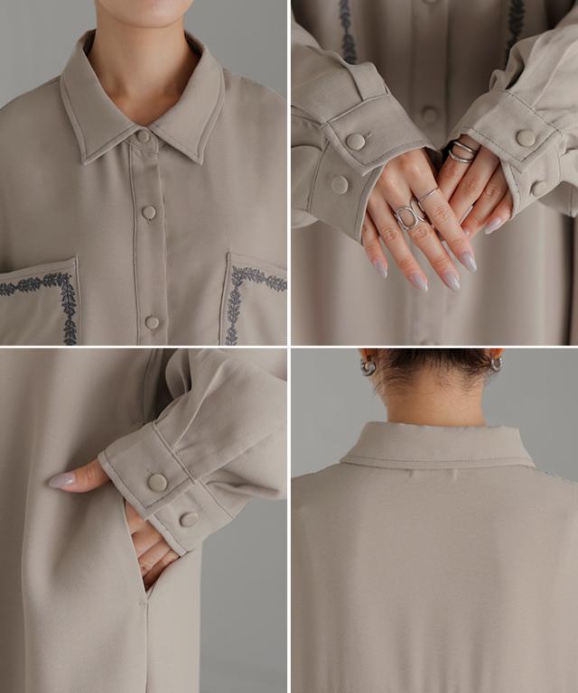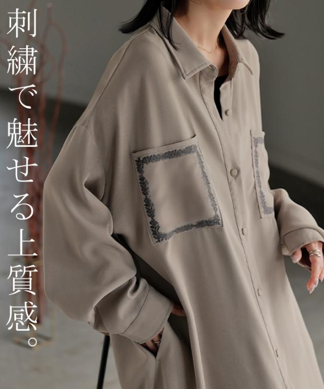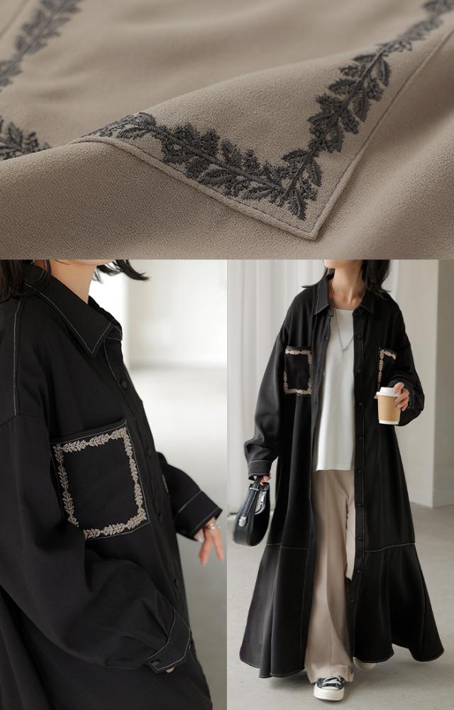 2025AW新作 ワンピース シャツ 長袖 シャツワンピース シャツワンピ レディース ロング ロングワンピース Aライン マキシ マキシワンピース ワンピ ロングシャツ ビッグ ポケット 刺繍 ロングワンピ 羽織 体型カバー 二の腕カバー 黒 ベージュ 秋 冬 HUG.U