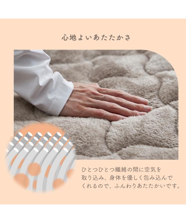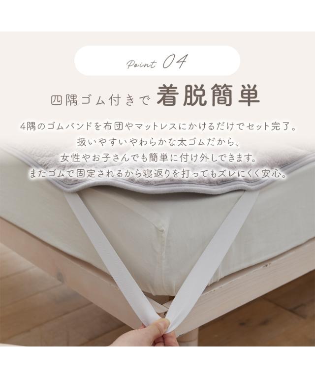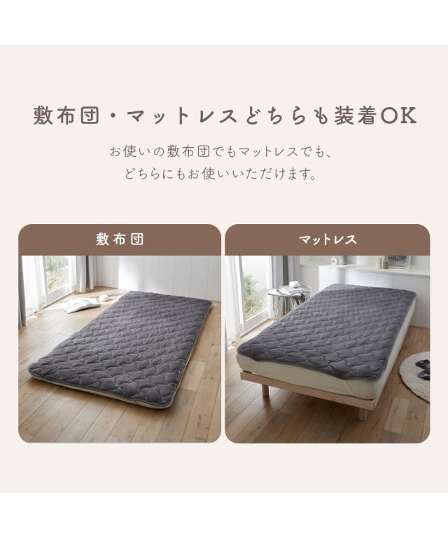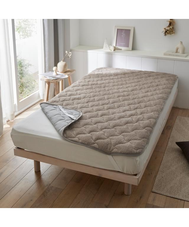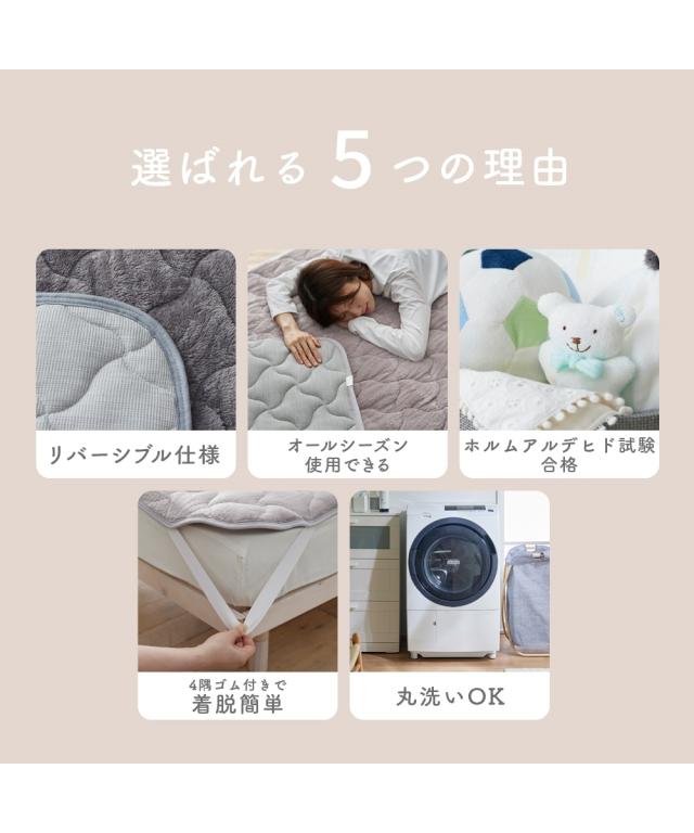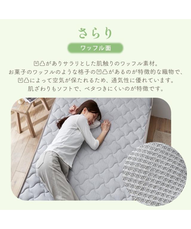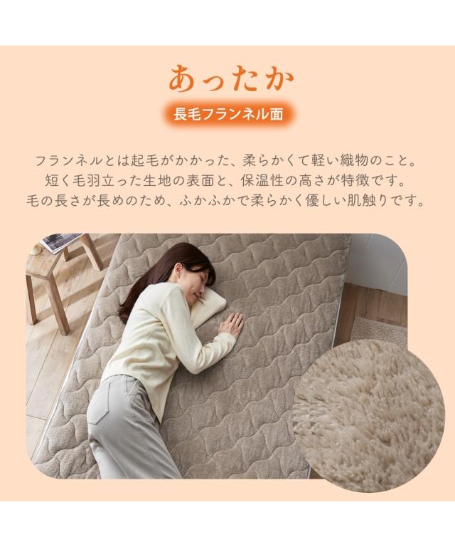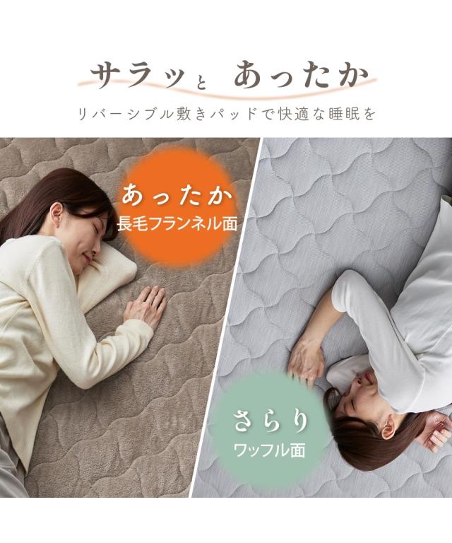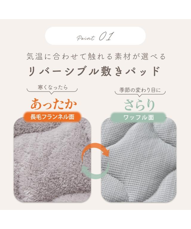 一年中快適!両面使える敷きパッドで、季節に合わせて快適な眠りを。肌寒い季節には、ふんわり柔らかな長毛フランネル面で暖かく。暑い季節には、さらっとした肌触りのワッフル素材面で心地よく。洗濯機で丸洗いできるので、いつでも清潔にお使いいただけます。四隅ゴム付きで、ズレにくく快適にお過ごし頂けます。オールシーズン使える敷きパッドで、あなたの睡眠をサポートします。1枚で2役のリバーシブルタイプの敷きパッドは春〜秋にかけてより快適に夜を過ごしていただけます。●種類【敷きパッドの魅力】マットレス・敷布団の上やボックスシーツ・敷きカバーなど、その上に敷いてお使いいただけます。肌に直接触れるので、肌触りや保温性などを敷きパッド1枚で調整することが可能です。また、シーツの上に重ねることで、気軽に取りはずしてこまめに洗濯できるのも大きな魅力です。●タイプ【4隅ゴムタイプの敷きパッド・ベッドパッドとは】4隅にゴムが付いており、マットレスや敷布団などに簡単に固定できる一般的な敷きパッド、ベッドパッドです。●シーズン特性WarmFabric:表面に起毛をあしらったふんわりあったか素材です。初夏〜冬のご使用に適しています。【リバーシブルタイプとは】裏表