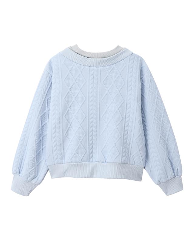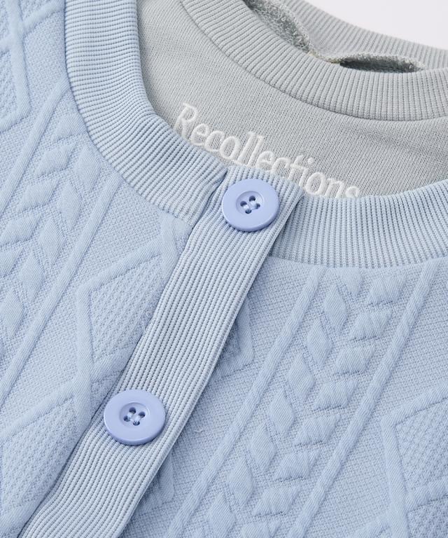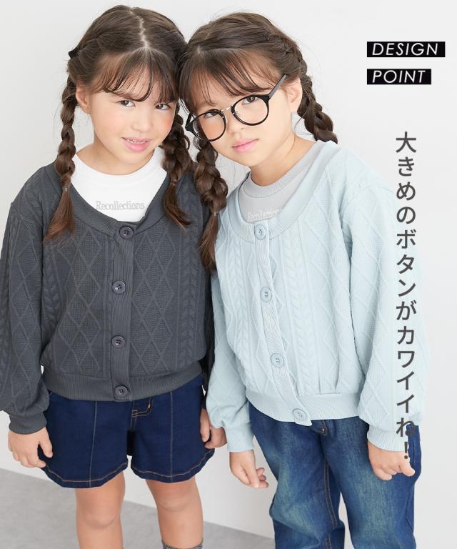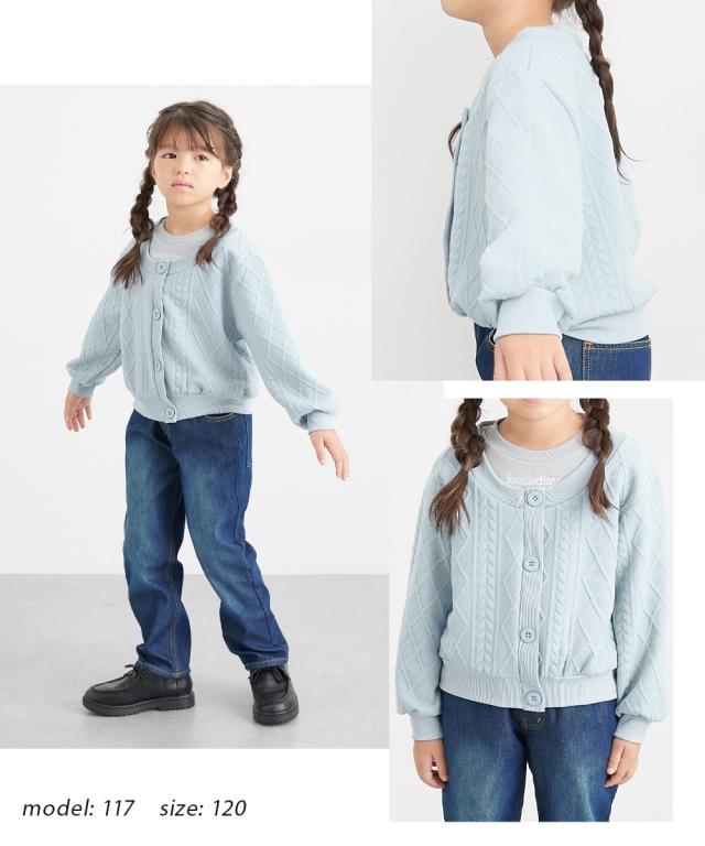 このトップスは、一枚で重ね着風のスタイルが完成する、おしゃれなドッキングデザインが魅力です。ふくれジャガード素材が上品な印象を与え、普段使いからお出かけまで幅広く活躍します。■デザイン・異なる編み柄のジャガード生地を組み合わせることで、立体感と奥行きのあるデザインに仕上げました。・丸みのあるシルエットとボリューム袖が、女の子らしい可愛らしさを引き立てます。・首元からちらりと見えるインナー部分には「Recollections」のロゴが刺しゅうされており、さりげないアクセントになっています。・ボタンは同色で統一され、全体的にまとまりのある上品な印象を与えます。■素材・衿元は裏毛素材のトレーナー生地で、ニット風のジャガードカーディガンを羽織ったような温かみのある雰囲気です■おすすめのスタイリング・デニムパンツと合わせてカジュアルダウン。スニーカーやキャップをプラスして、元気いっぱいのデイリースタイルに。・フレアスカートやプリーツスカートと合わせて、お嬢様風のガーリースタイル。バレエシューズやリボンヘアアクセサリーで上品さをプラス。・ショートパンツとロングブーツを合わせて、トレンド感のある大人っぽいスタイル。ミニバッグやベレー帽