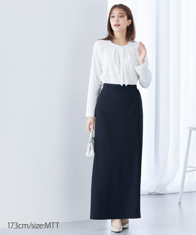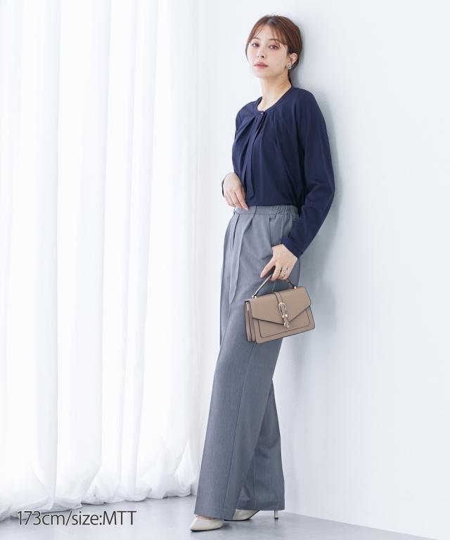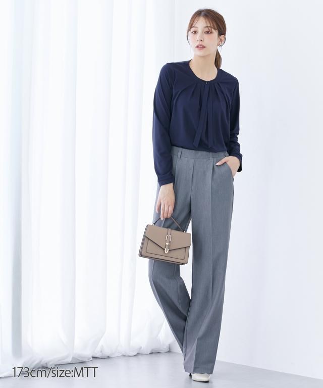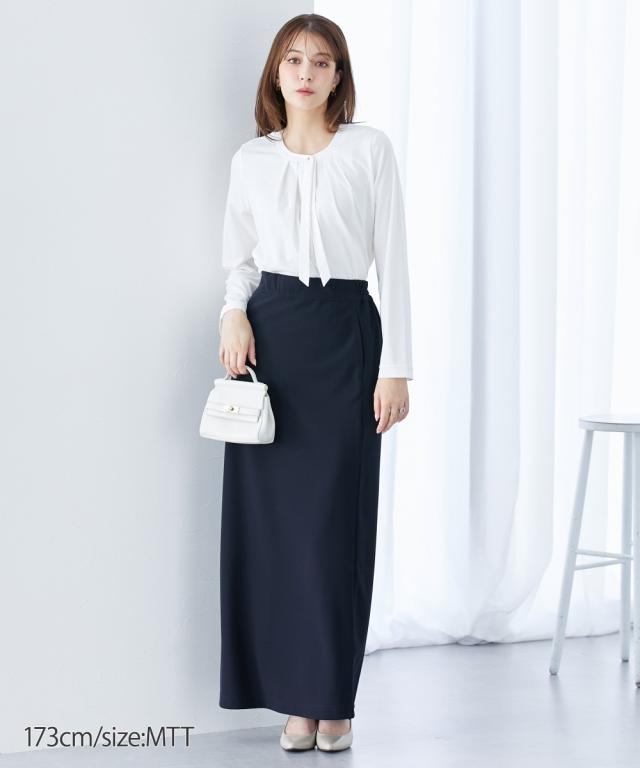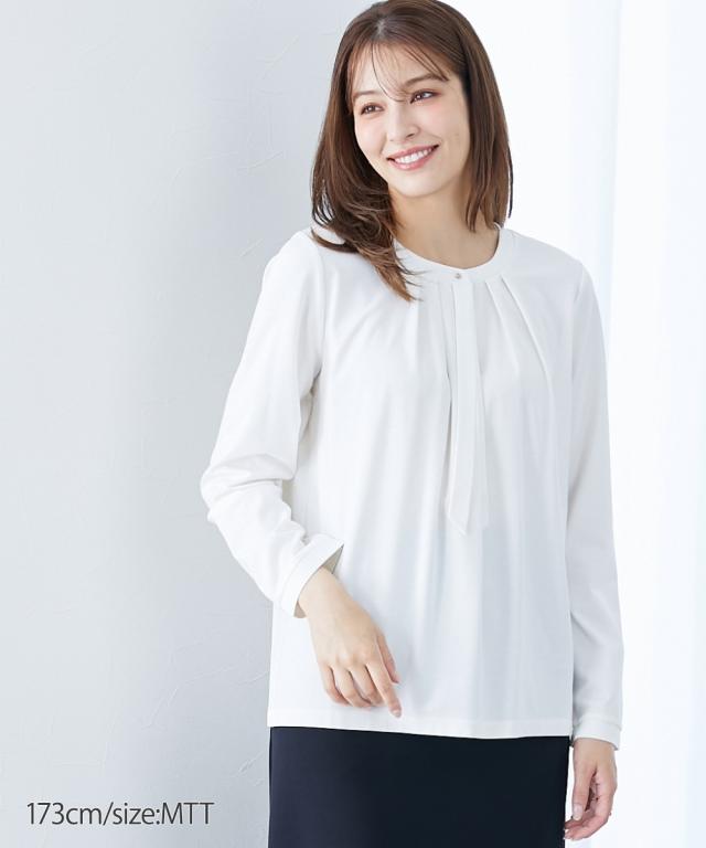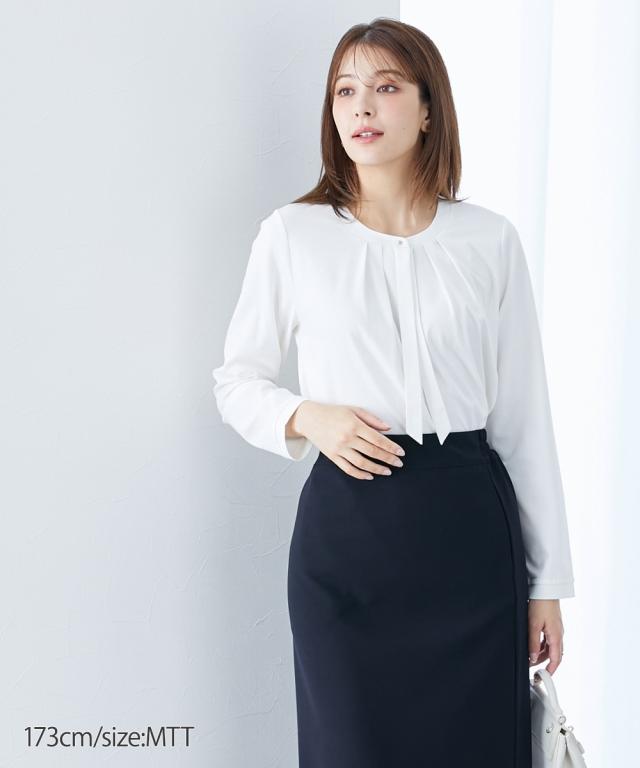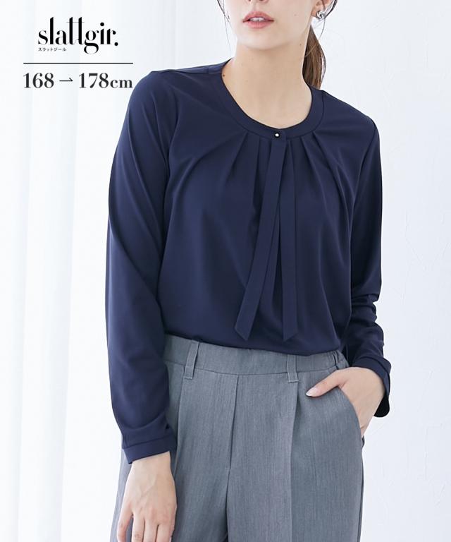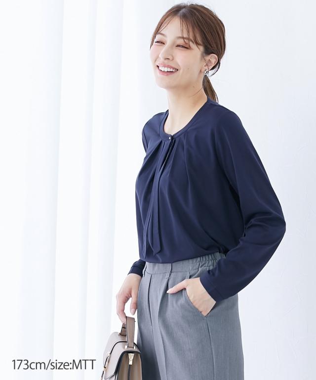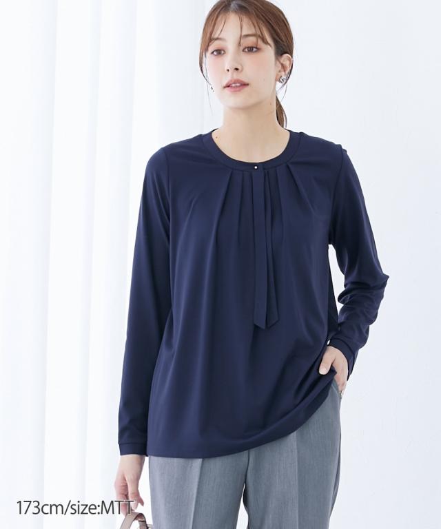 【高身長の方向け】実はカットソーでできたラクチンシャツ!ボウタイ付できちんと感も ■デザイン・オフィスにもお出かけにも、セレモニー、オフィスまで活躍させられるブラウス見えカットソー・胸元のタイがカットソーながらきちんと見えするポイント・衿元のゴールドボタンで華やかさアップ■素材ソフトで滑らかなスムース素材を使用しています。■おすすめのスタイリングスカートともパンツとも好相性