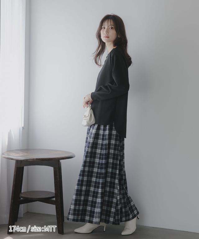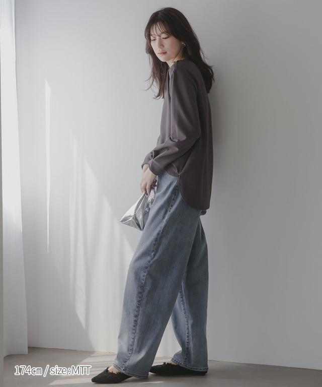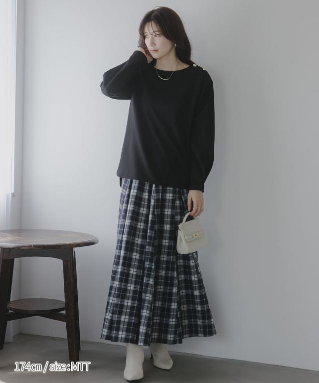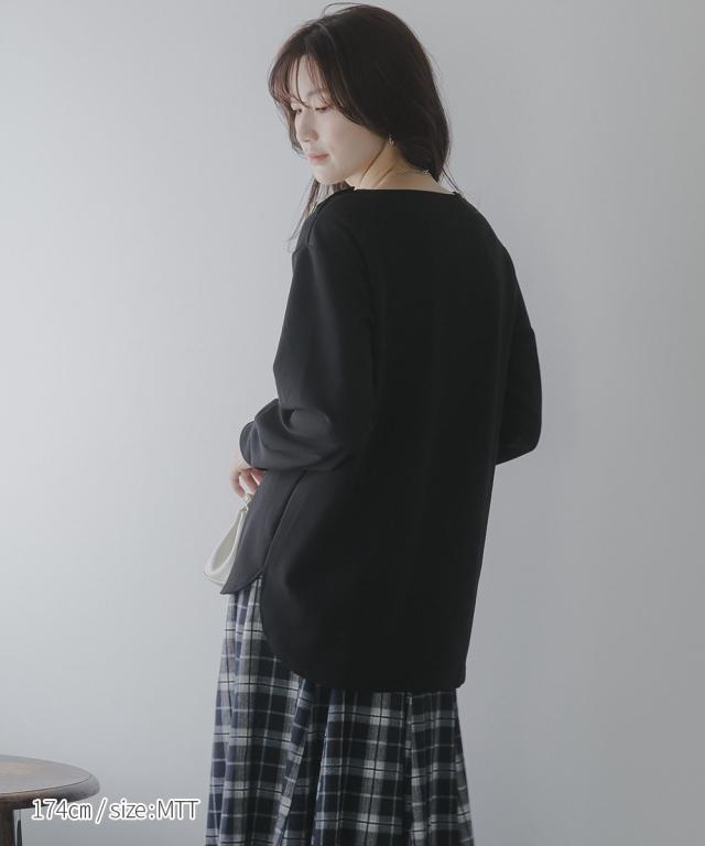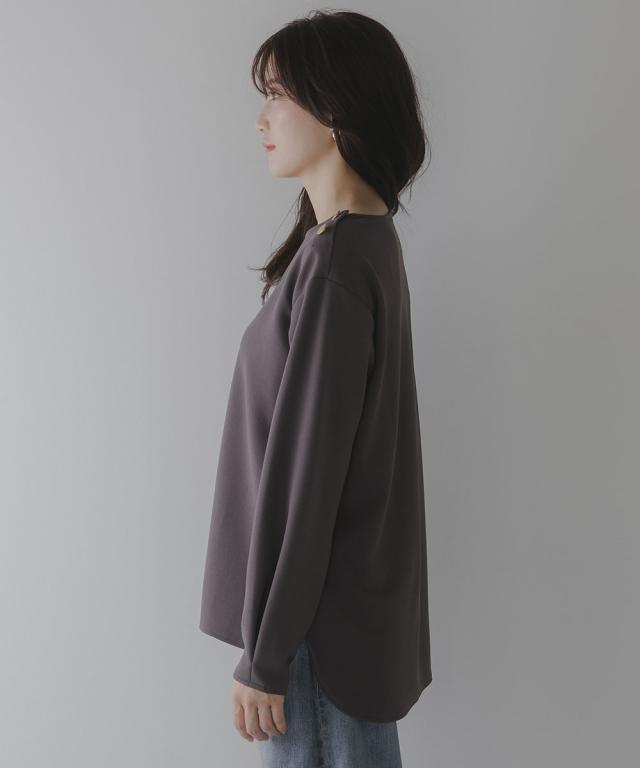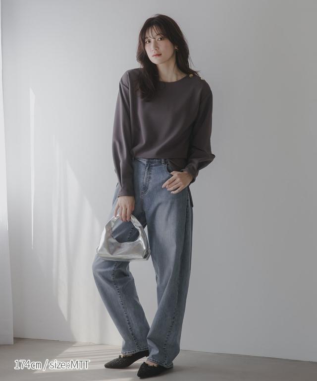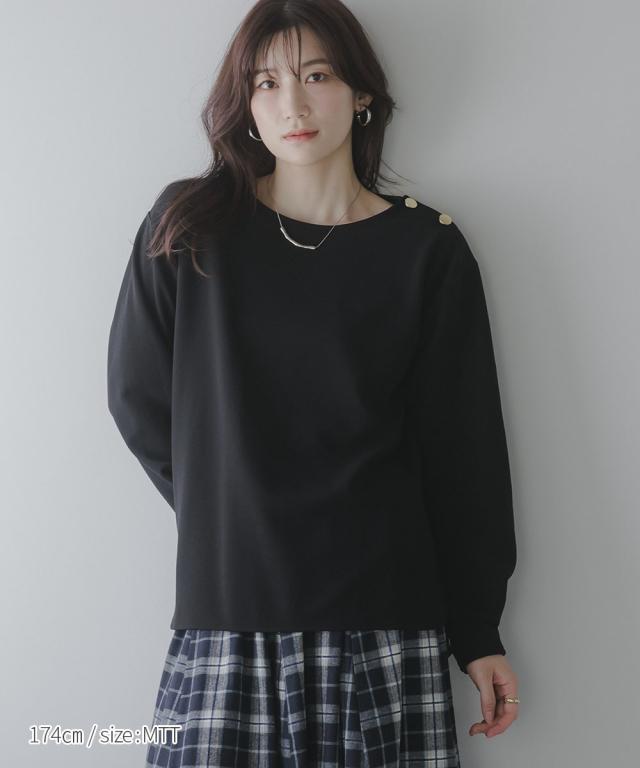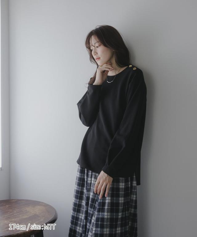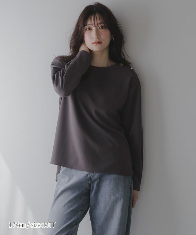 【高身長な方向け】シンプルながらもこなれ感のあるプルオーバー■デザイン・シンプルで洗練されたデザインに、ゴールドボタンのアクセントが映える上品なプルオーバー・肩にあしらった2つのボタンがさりげない存在感を放ち、カジュアルにもきれいめにもマッチします・クルーネックで首回りすっきり・程よくゆとりのあるシルエットで体型カバーにも ・高身長さん専用設計で、着丈・袖丈長めにおつくりしています■素材しなやかな落ち感のあるカットジョーゼット。肌触りがよく、長時間の着用でも快適。オンオフ問わず活躍できる一枚です。■おすすめのスタイリング・ハイウエストデニムなどとの組み合わせてシックな大人カジュアルな雰囲気にも ・フレアスカートとのスタイリングでフェミニンMIXコーデにも仕上がります ・きれいめパンツと通勤着スタイルにもマッチします。