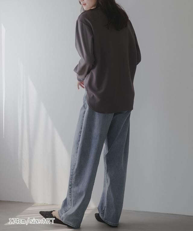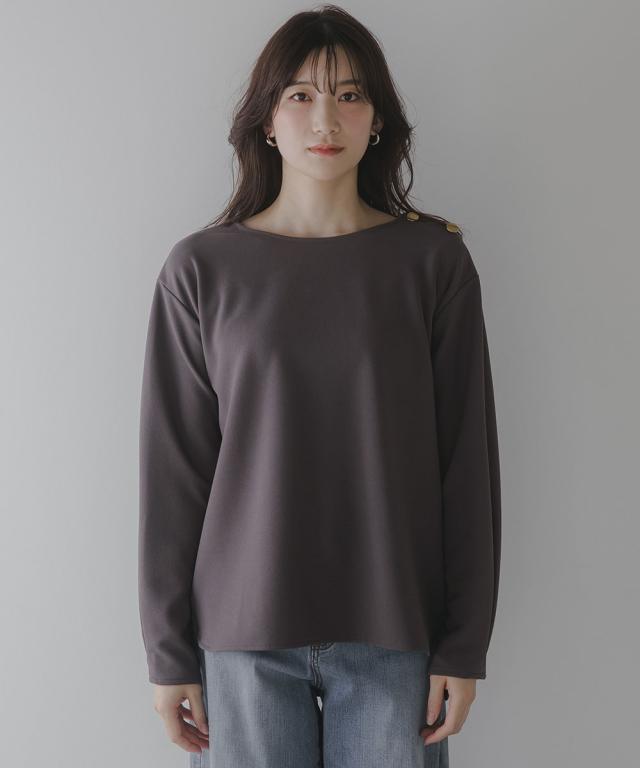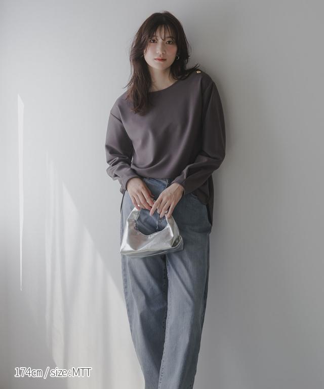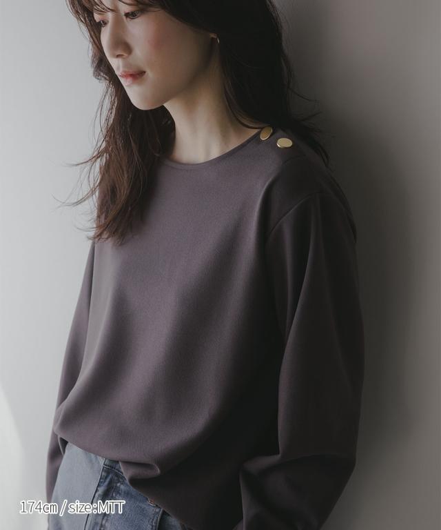 【高身長な方向け】シンプルながらもこなれ感のあるプルオーバー■デザイン・シンプルで洗練されたデザインに、ゴールドボタンのアクセントが映える上品なプルオーバー・肩にあしらった2つのボタンがさりげない存在感を放ち、カジュアルにもきれいめにもマッチします・クルーネックで首回りすっきり・程よくゆとりのあるシルエットで体型カバーにも ・高身長さん専用設計で、着丈・袖丈長めにおつくりしています■素材しなやかな落ち感のあるカットジョーゼット。肌触りがよく、長時間の着用でも快適。オンオフ問わず活躍できる一枚です。■おすすめのスタイリング・ハイウエストデニムなどとの組み合わせてシックな大人カジュアルな雰囲気にも ・フレアスカートとのスタイリングでフェミニンMIXコーデにも仕上がります ・きれいめパンツと通勤着スタイルにもマッチします。