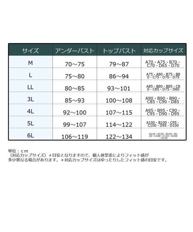 品質=身生地:綿95%・ポリウレタン5% 原産国:中国製 備考:単位:cm (対応カップサイズ)*目安となりますので、個人体型差によりフィット感が多少異なる場合があります。*対応カップサイズはゆったりしたフィット感の目安です。