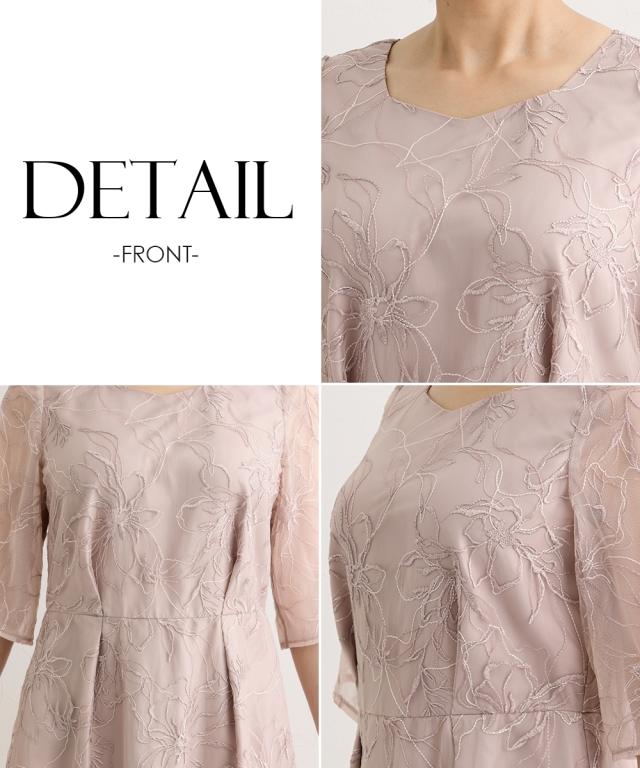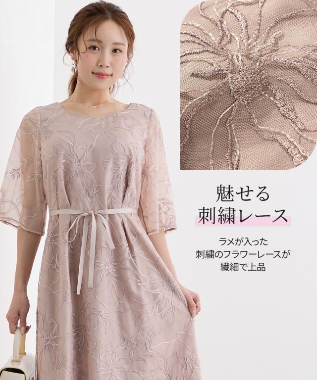【グラマーバストさん向け】ニッセングラマーの洋服は大きな胸をキレイに魅せることにこだわった、グラマーバストさん専用設計。「胸が入る」だけでなく、胸が大きい女性のスタイルが美しく見えるようにこだわりました。シリーズ商品は「大きな胸をキレイに魅せる服」で検索して下さい。繊細な刺繍とシアー素材が引き立てる 上品華やかワンピース■デザイン・グラマーバスト専用設計独自の設計でバスト部分の高さをしっかり出しているので、メリハリのある美しいシルエットを叶えます。・魅せる刺繍レースラメが入った刺繍のフラワーレースが繊細で上品・ほんのりシアーのフレアスリーブ二の腕が見えすぎない、絶妙なシア感。袖裏は無地のチュールを重ねてあるので、ラメのチクチクも軽減・抜け感のあるダイヤネックデコルテを綺麗に見せるダイヤネックが上品な胸元を演出・取り外しリボン付きサテンリボンは、ウエストマークでぎゅっと絞って細見え。リボンなしでもシンプルに着こなせる・後ろファスナー後ろファスナーで着脱可能。後ろ姿もすっきり・スマホがすっぽり入るポケット付き深めのポケットで安心。リップやハンカチなどちょっとした小物を入れられて便利です。■素材ラメ刺繍を施したシア