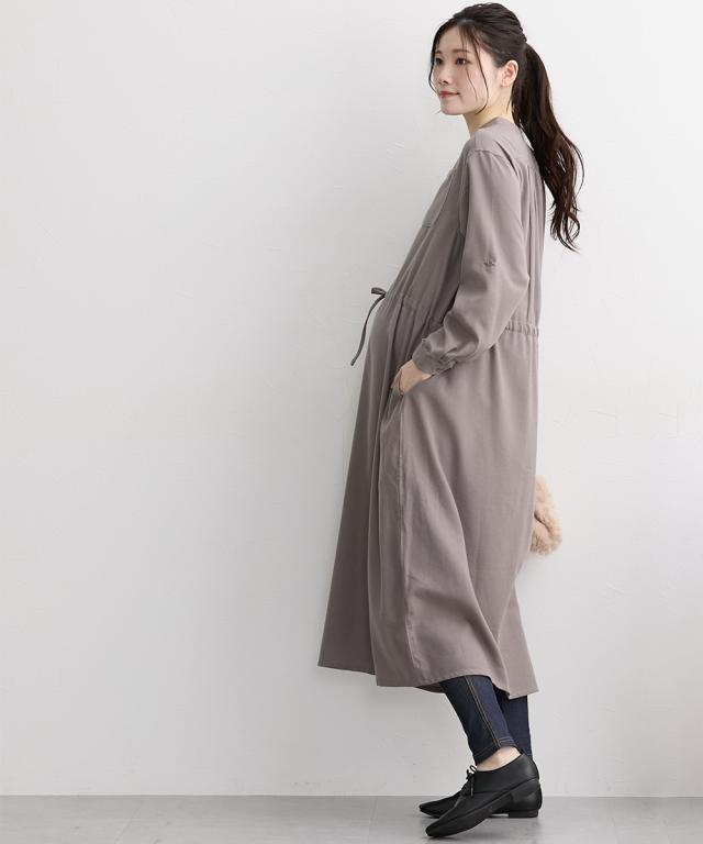 ふんわりしたビエラ起毛素材のマタニティ長袖ワンピースです。■design・お腹のラインが目立たない、ゆったりしたシルエット・首元はすっきりしたVカットで、上品な印象を与えます。・ウエストのリボンでシルエットを調節でき、お腹の変化にあわせて産前から産後まで長く着られます。■point・授乳は前ボタンをあけて授乳ができます。 特別な授乳口がないので、卒乳後も普通のワンピースとして長く着られます ・両脇にポケットがあるので、スマホやハンカチなど、ちょっとした小物が入れられて便利です。・袖はボタンを留めてロールアップができるので、気温に合わせて調整できます。 家事や育児で袖を上げたい時にも便利です ■fabric・柔らかく温かみのある織物生地のビエラ起毛素材