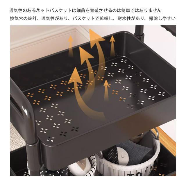 【軽くて丈夫の4段のラック】非常に頑丈です。カゴのメッシュが細かくて物を載せやすくしています。またトレーを外すことができ、掃除もしやすくなります。中身が見えますので、探しやすく通気性も良くて便利です。