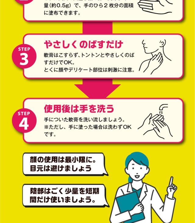 ・大人の人差し指の、先端から第一関節までにお薬を乗せた量(約0.5g)が、大人の手のひら2枚くらいに塗ることができる量の目安です。