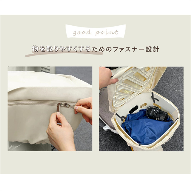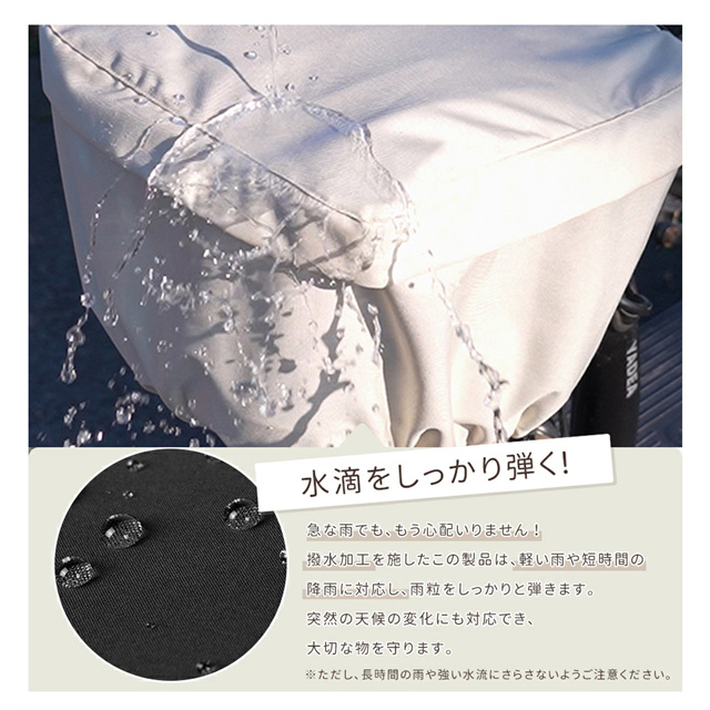 | 特徴 | 防水性能を向上させた自転車カゴカバー 防水です。 ダブルファスナー設計で、前後左右どこからでも物の出し入れが可能。 前カゴカバーとしても使用可能で、防水生地を採用しているため、一般的な撥水素材よりも超厚手で丈夫、長持ちします。 止水ファスナーにより、ファスナー部分からの雨の侵入を防ぎ、撥水性と耐久性が抜群です。 ひったくりや荷物の飛び出しを防ぐだけでなく、防水仕様で荷物を雨からしっかり保護します。 |