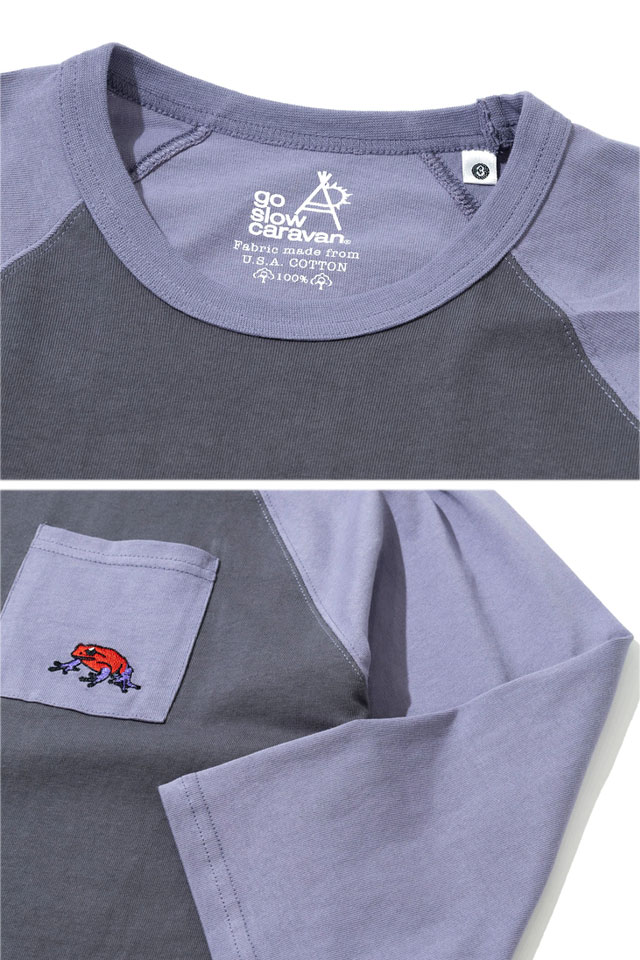旅行やフェス、キャンプ、サーフィン、サイクリングなど、外遊び好きの仲間が集まってはじめたブランド【go slow caravan】より「USA/C 色々ポケット刺繍 八分袖ベースボールTシャツ(351901)」のご紹介です。 go slow caravanの色々刺繍シリーズから、新作が仲間入りしました! 季節の変わり目に、重ね着やインナーにも重宝するベーシックシルエットラグランベースボールTシャツです。 身頃と、袖と背中で配色切り替えが施されており、スポーティーなカラーリングに仕上がりました。 胸ポケットにはボディーカラー毎に異なるワンポイント刺繍を施しています。 A柄はほねほねのホワイト、B柄はタコさんウインナーのアイボリー、C柄はイチゴヤドクガエルのスミクロです。 生地には定番のUSAコットンを使用。 米綿ならではのシャリ感と柔らかさはデイリーウェアにピッタリ! 丈夫で安心感のある生地です。 | ||||||||||||||||