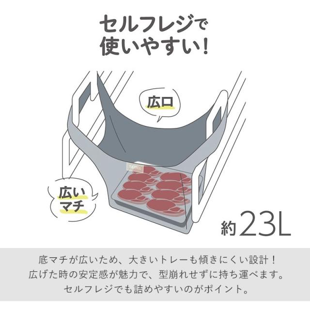 セルフレジでも使いやすい自立型で、広めの底マチがあるから、大きなトレーやお惣菜パックも傾きにくく安心。